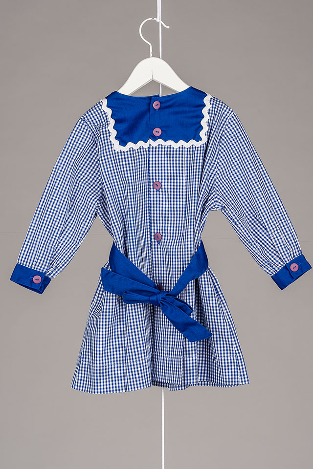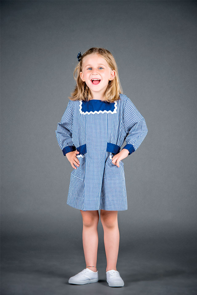 Manga comprida com punho e botão. Frente macho largo, pespontado até à cintura.Tira de cinto apertar atrás com laço. Bolsos de chapa, encaixe no topo e avivada com fita zig zag.