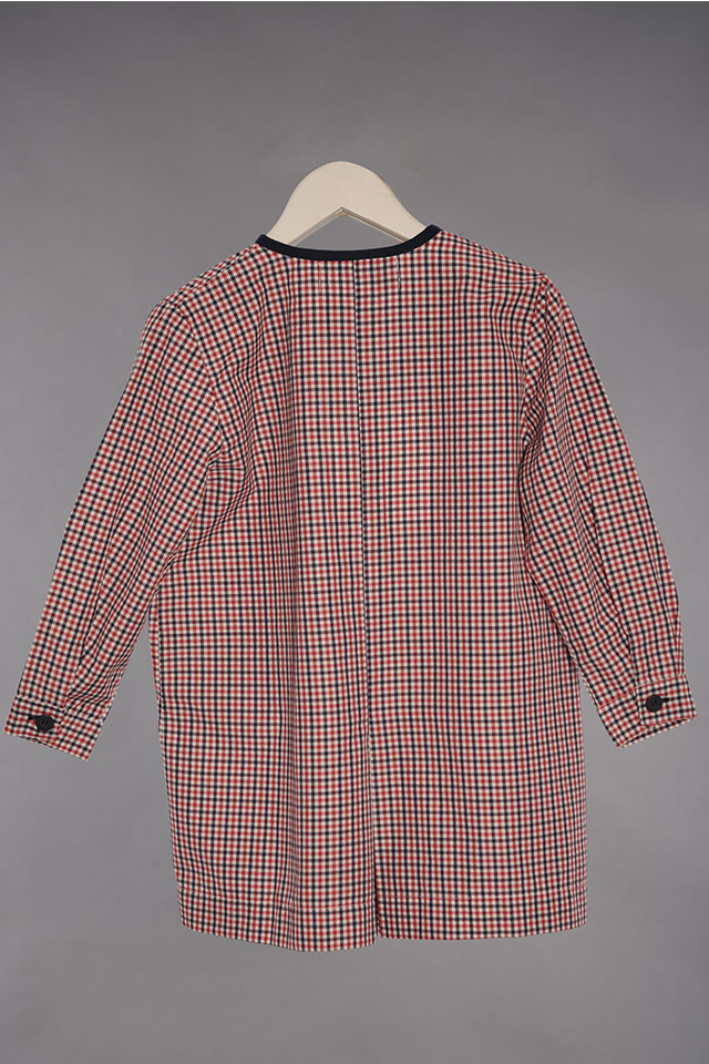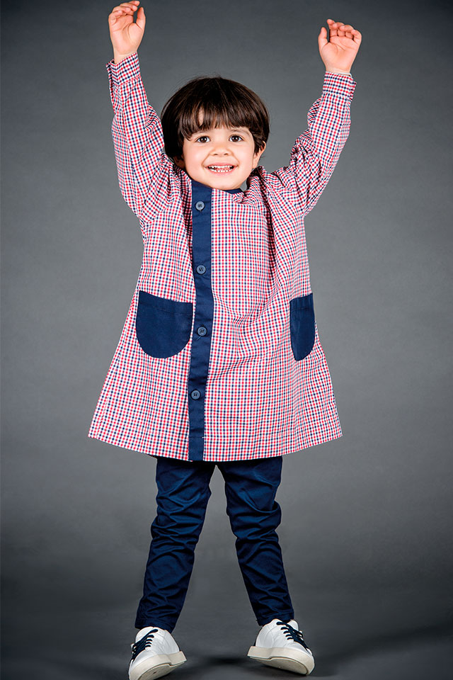 Bata de criança, decote redondo, a apertar na lateral com botões. Manga comprida com botão no punho. Na frente, bolsos de chapa, oval e cor contraste. Nas costas, macho ao centro.
