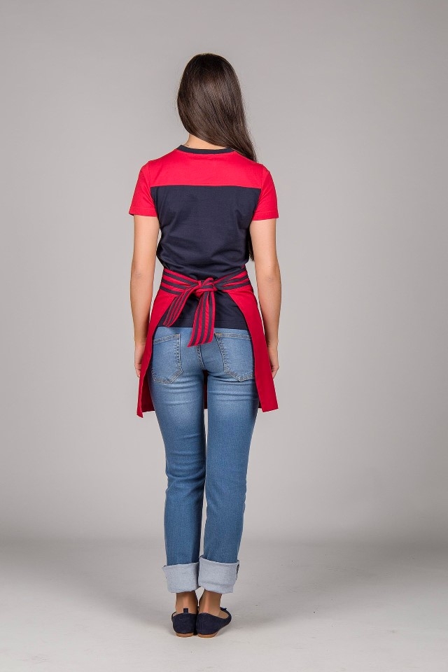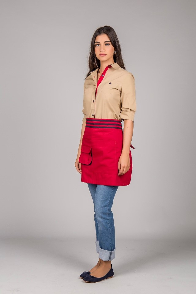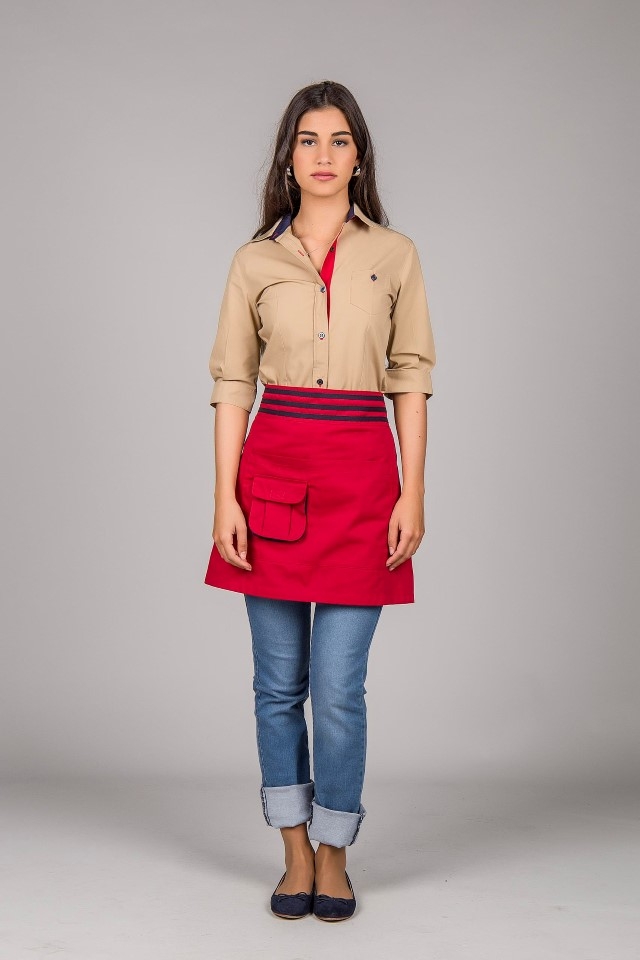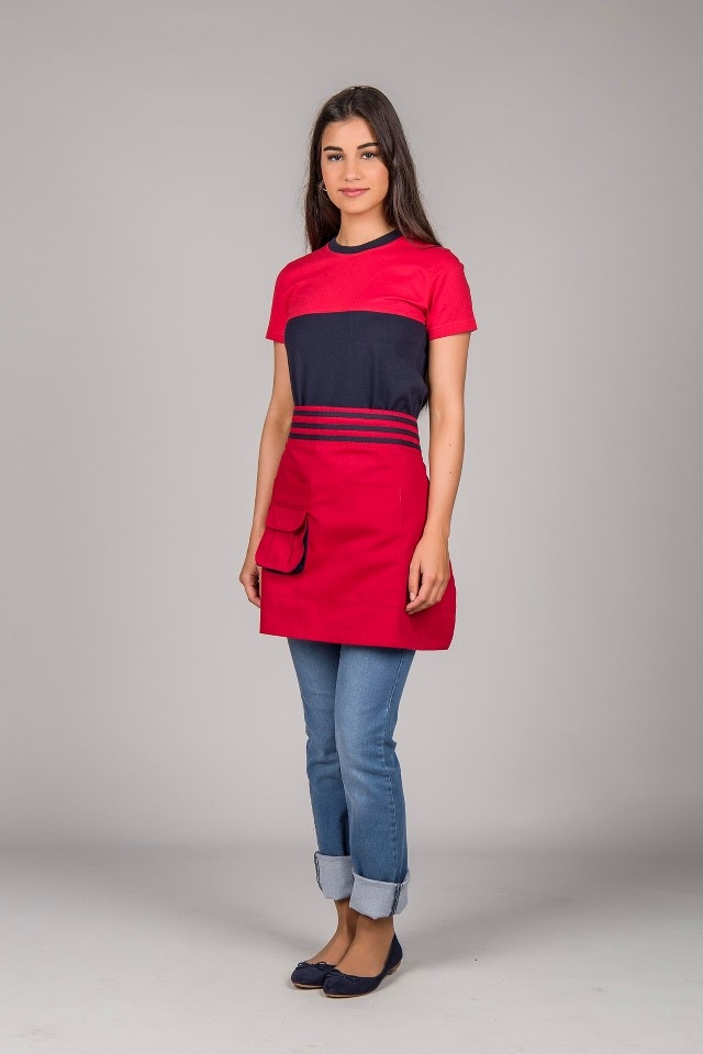 Avental curto com 2 bolsos e cinto com aplicações de cor contraste.