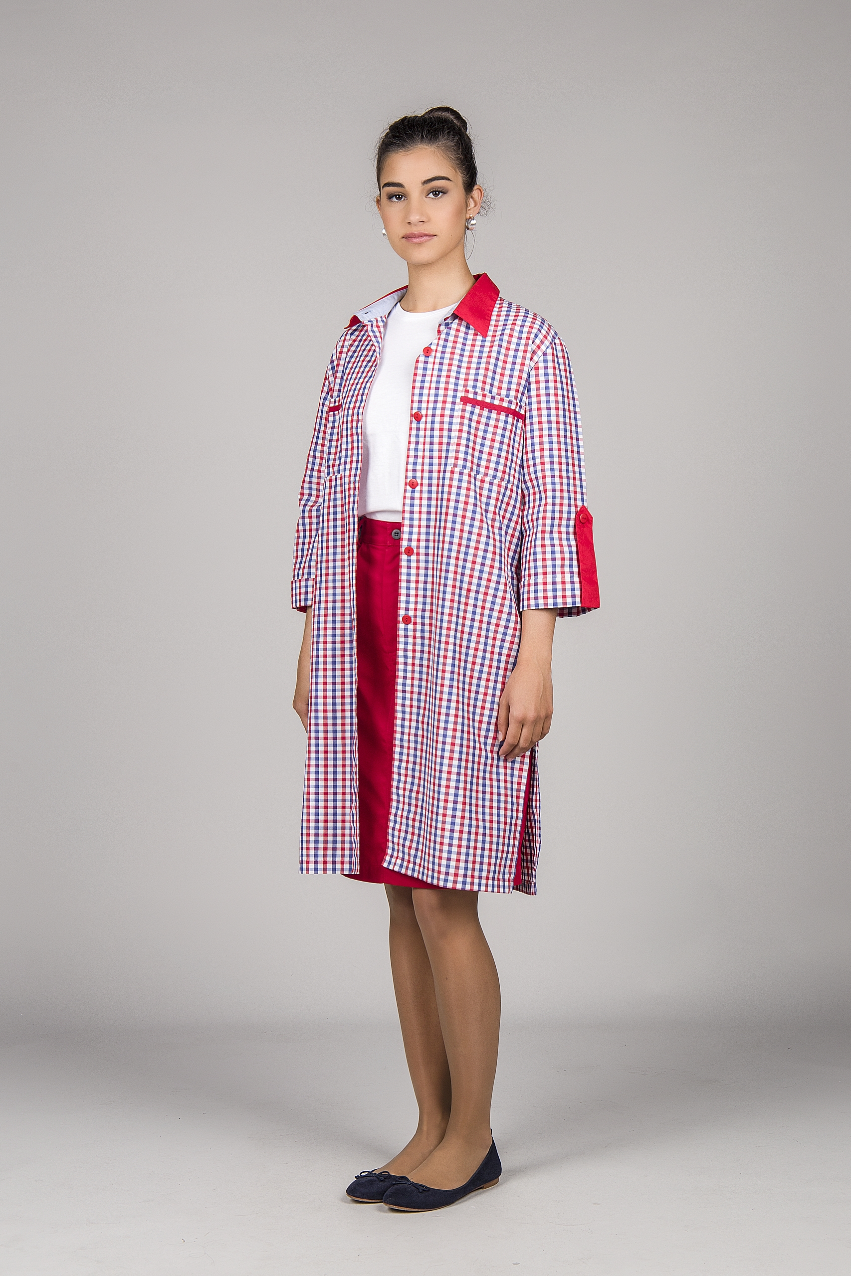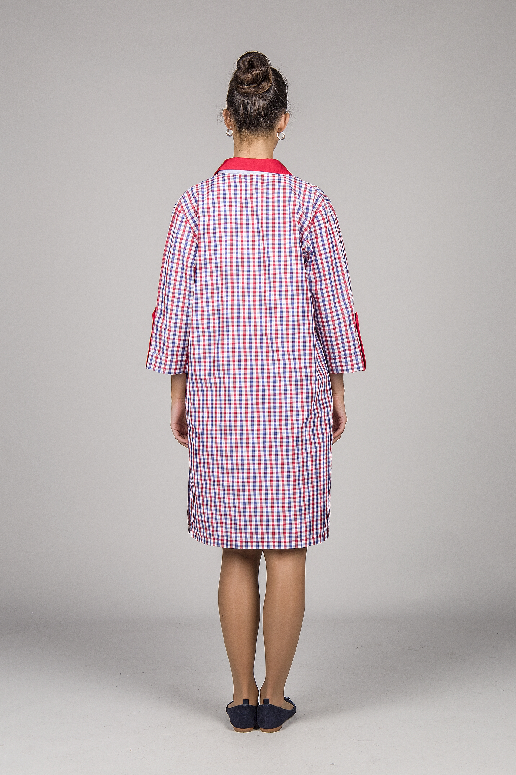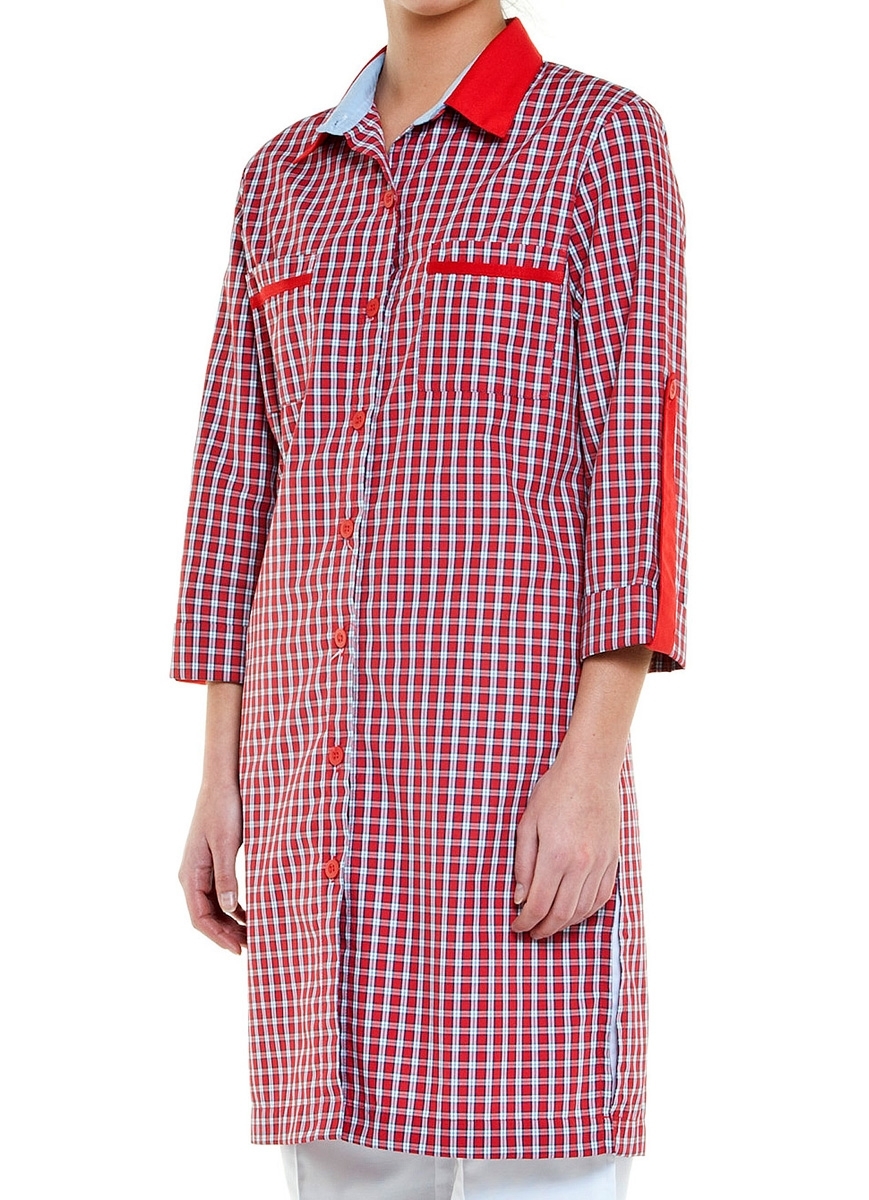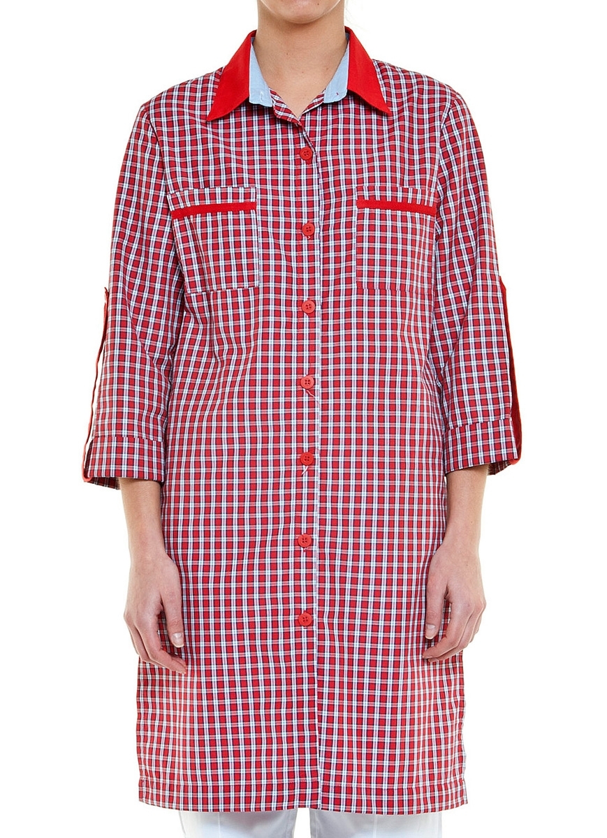 Bata com manga 3/4 e presilha reguladora. Aperta com botões na frente. Dois bolsos de chapa no peito. Detalhes em cor contraste na gola e bolsos.