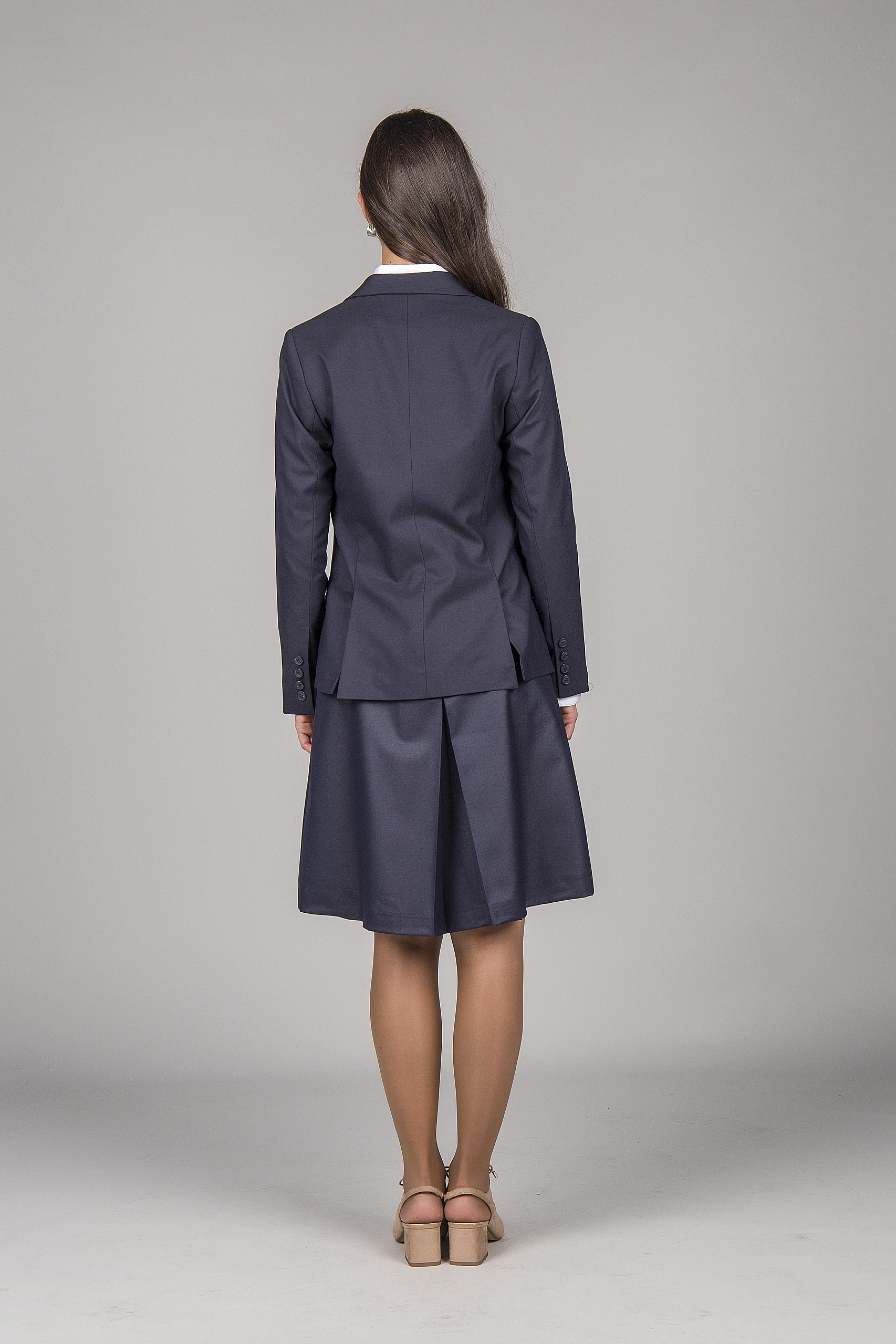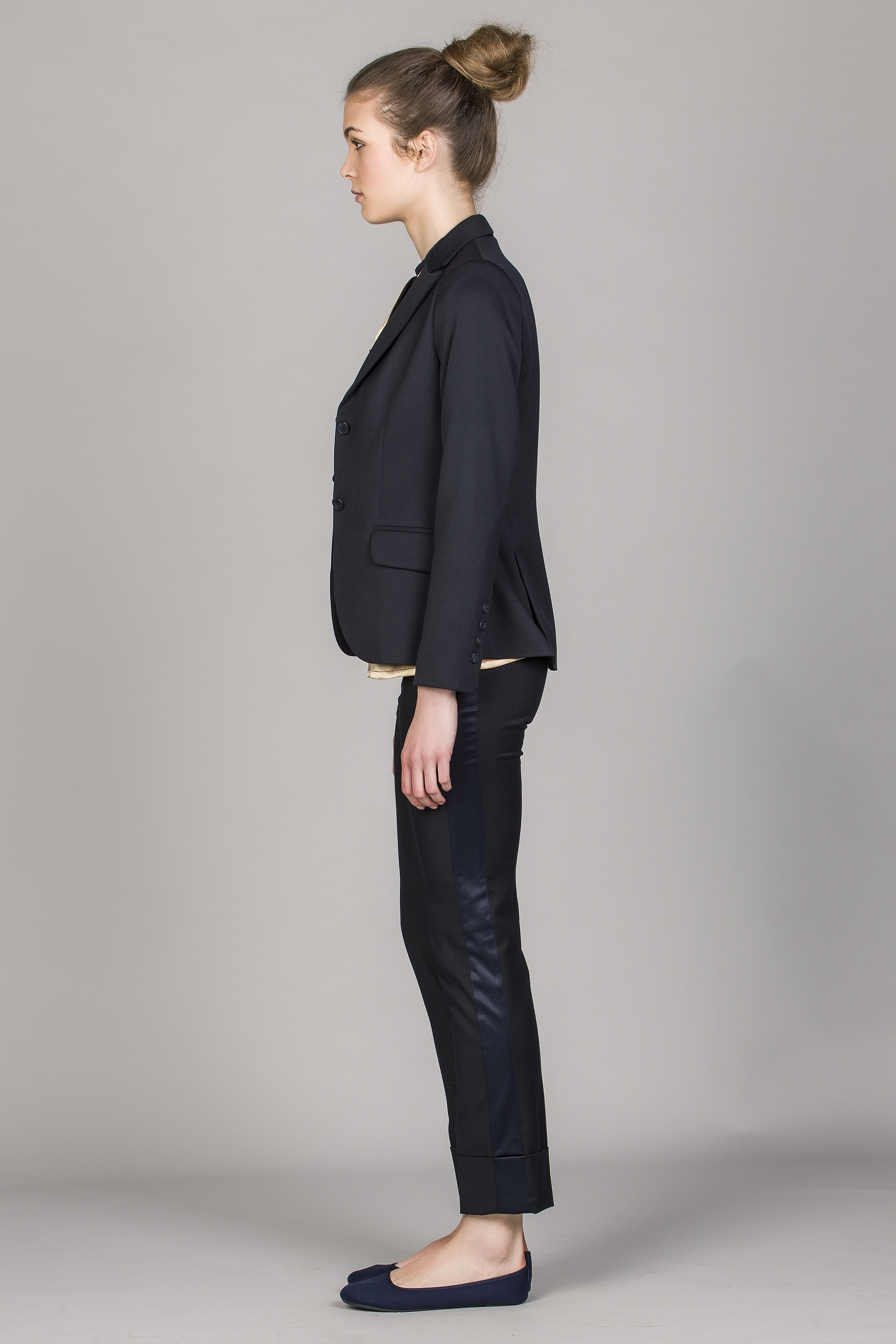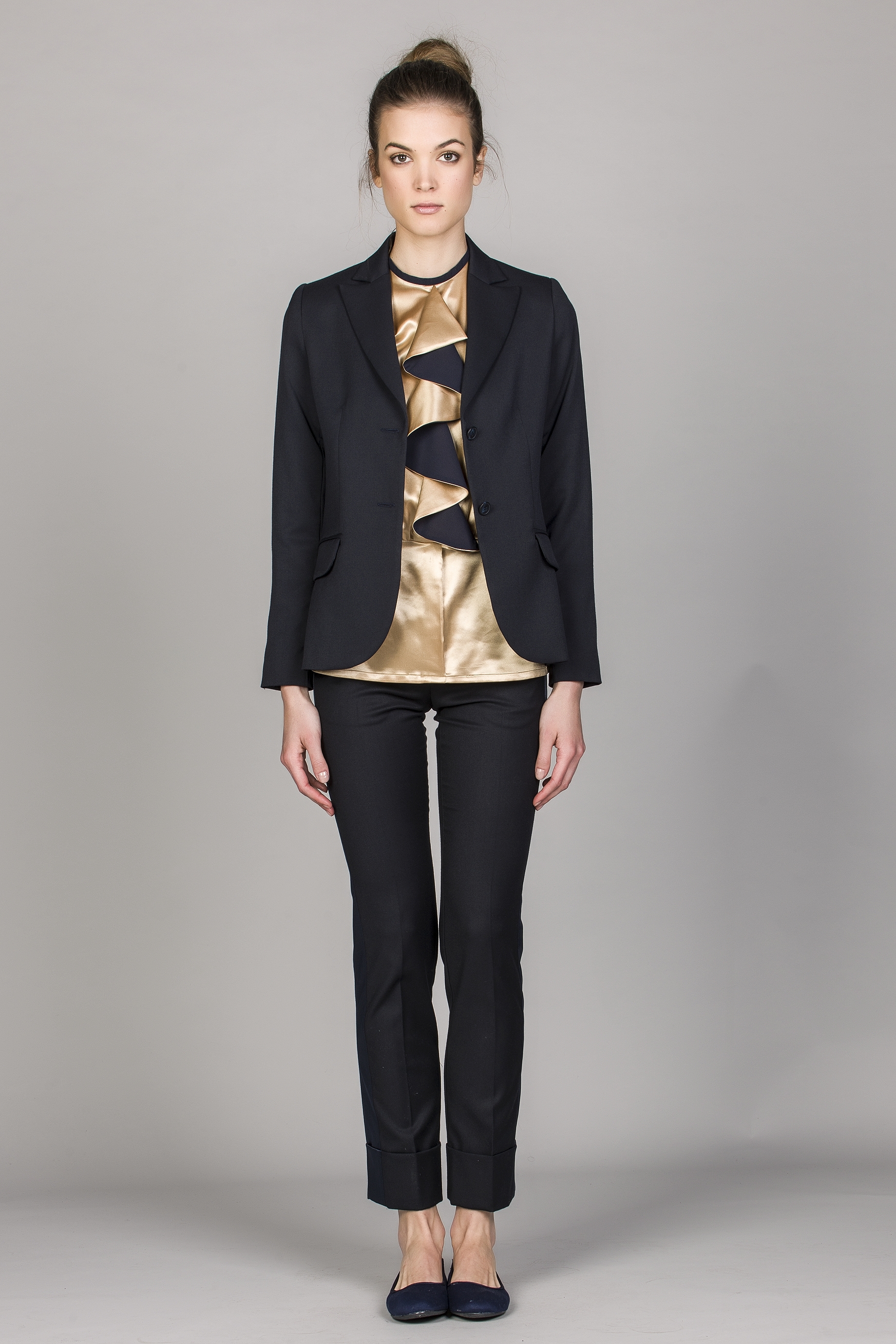 Blazer de senhora, cintado com lapela pontiaguda larga. Aperta com 2 botões. Bolsos com pala, tipo envelope. Pinças frente e costas para melhor fitting. Punho com 4 botões. Atrás, aberturas paralelas.