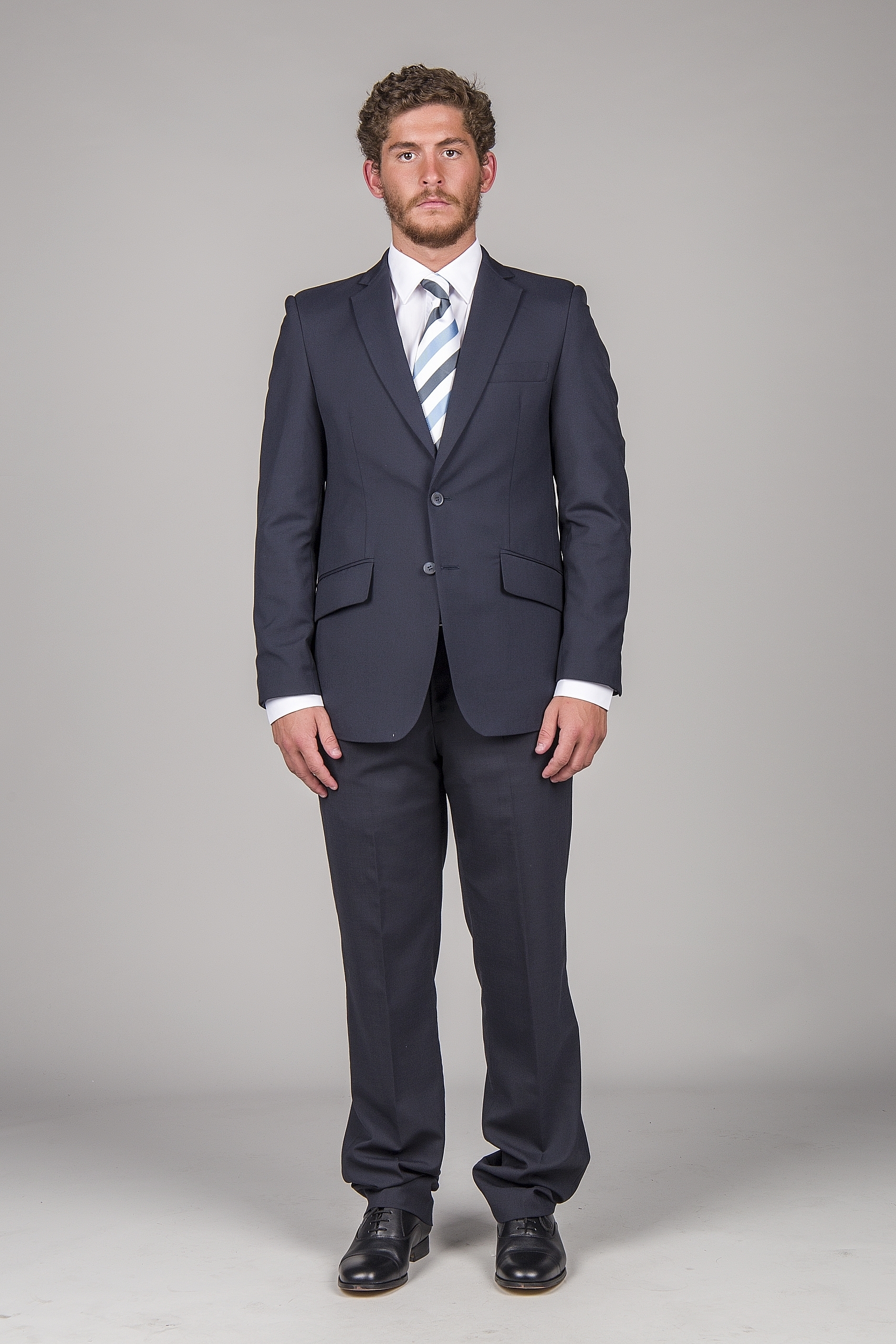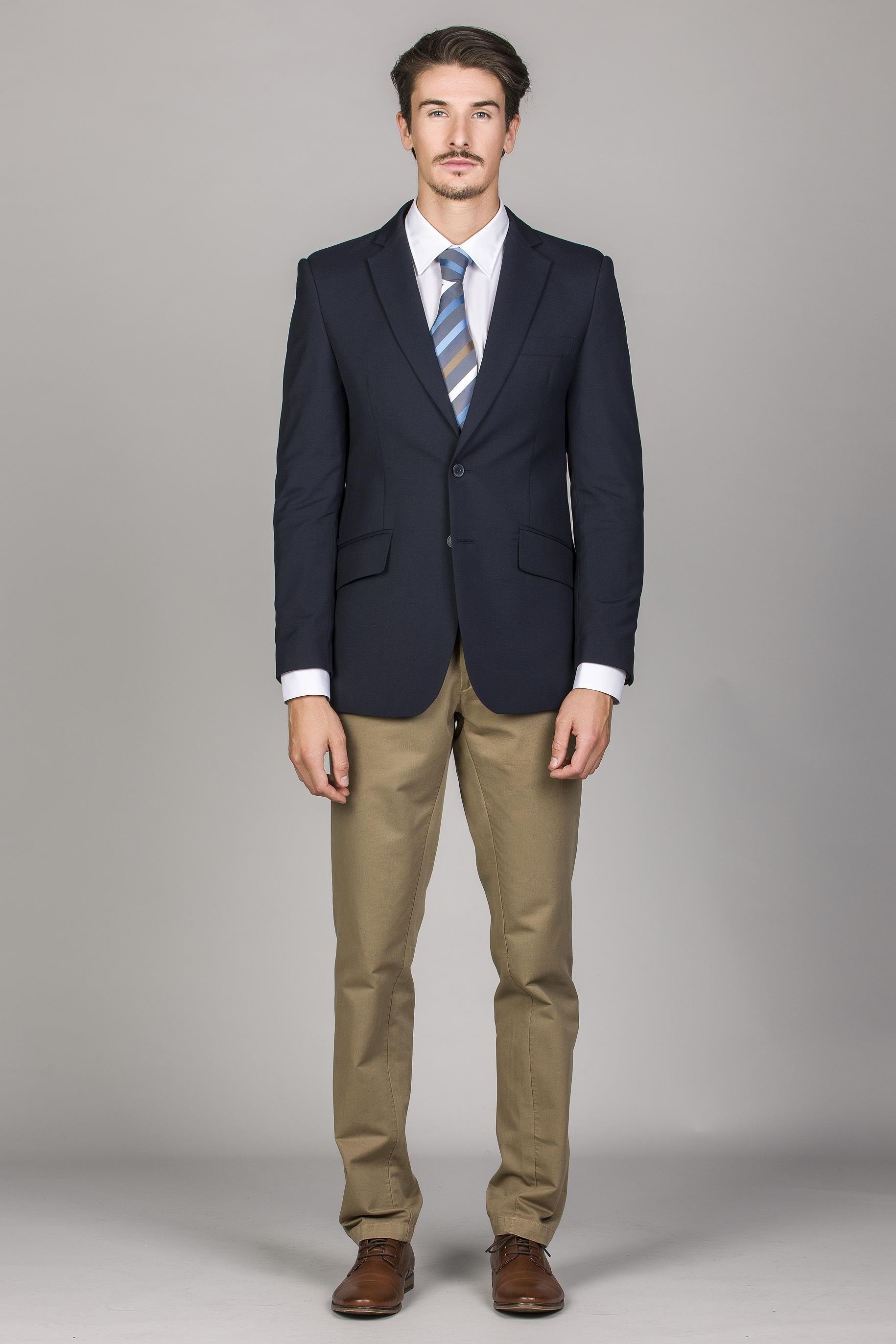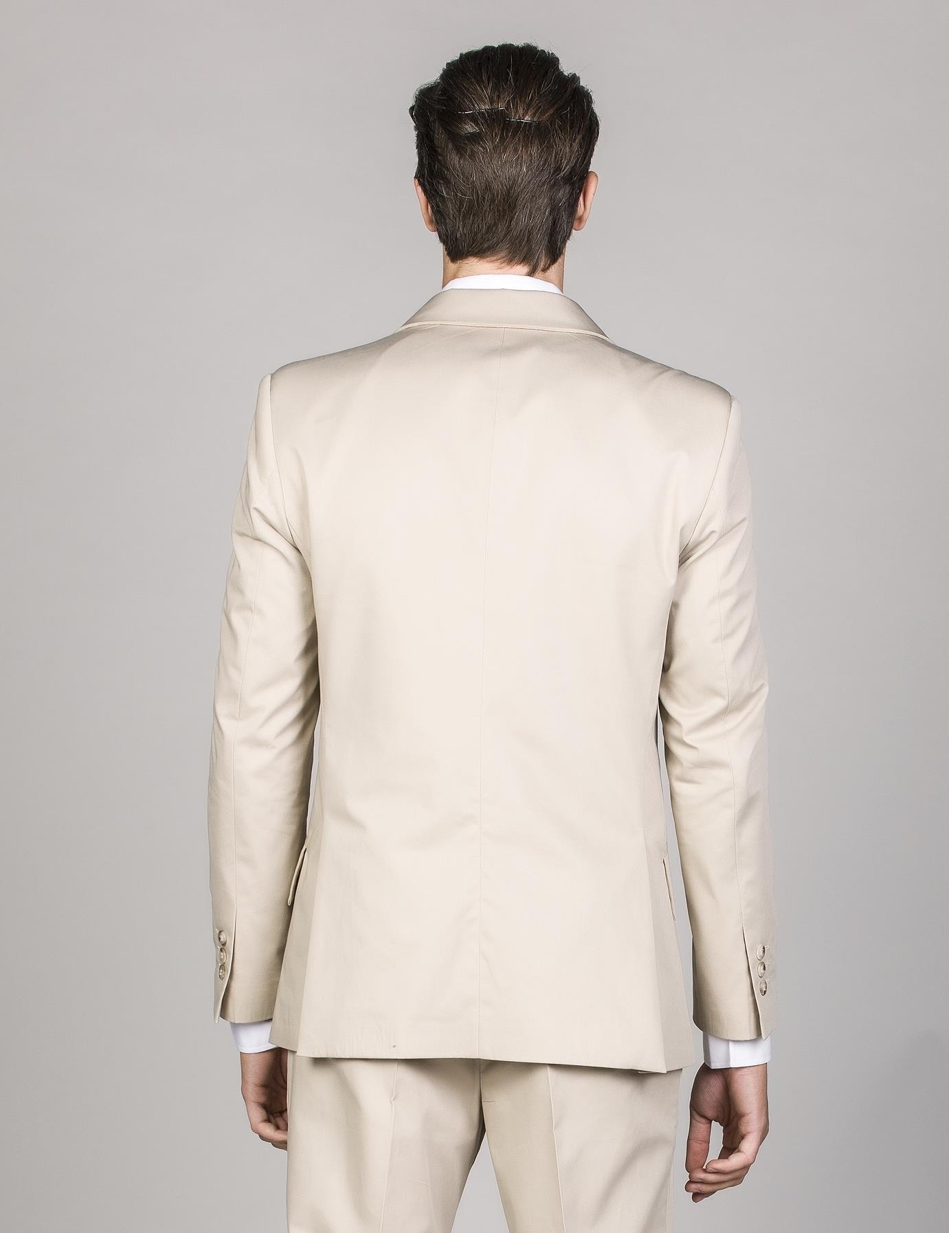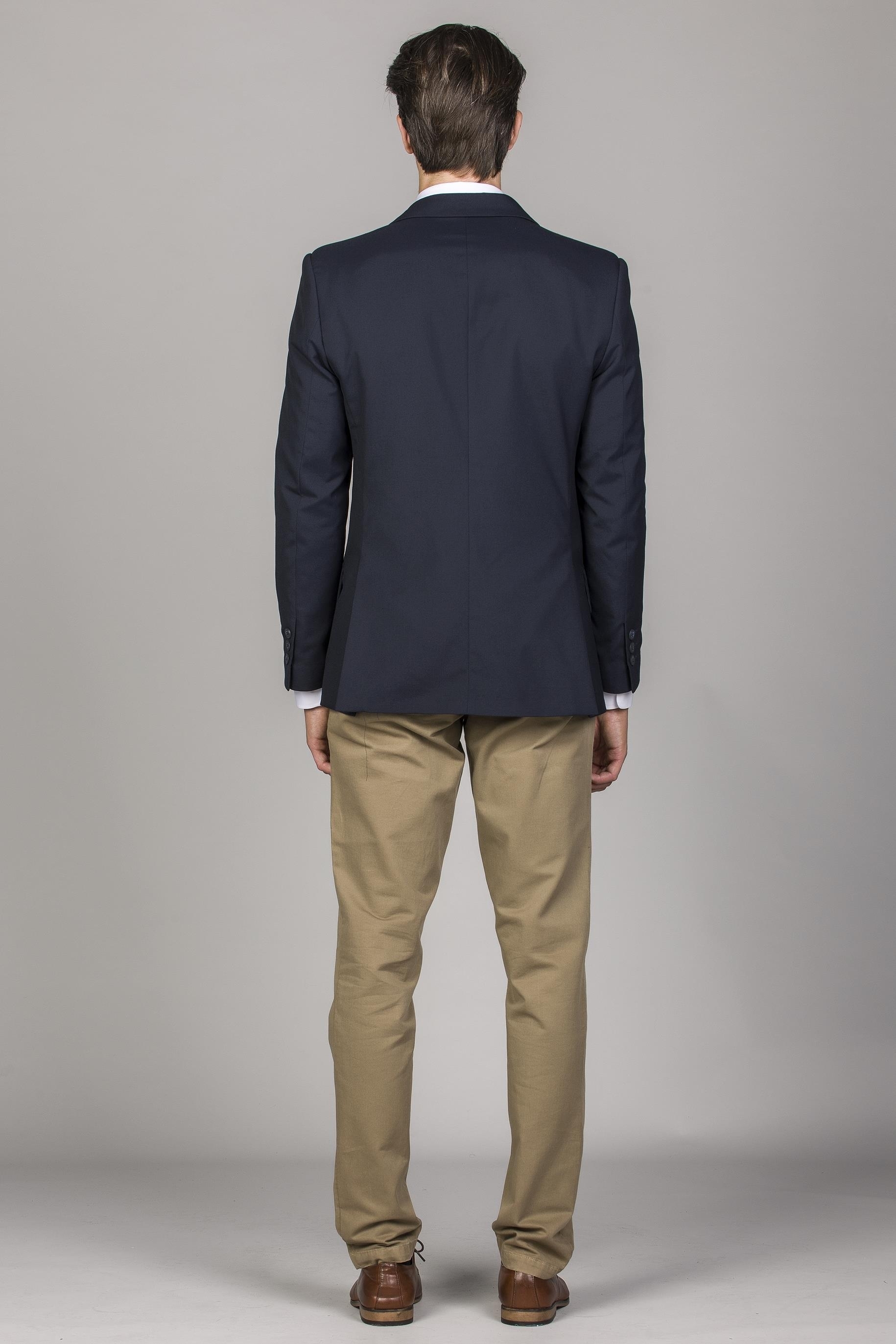 Blazer de homem com lapela triangular larga. Pinças na frente para melhor fitting. Aperta com dois botões. Bolsos metidos com pala, tipo envelope. Punho com 3 botões. Atrás, aberturas paralelas.