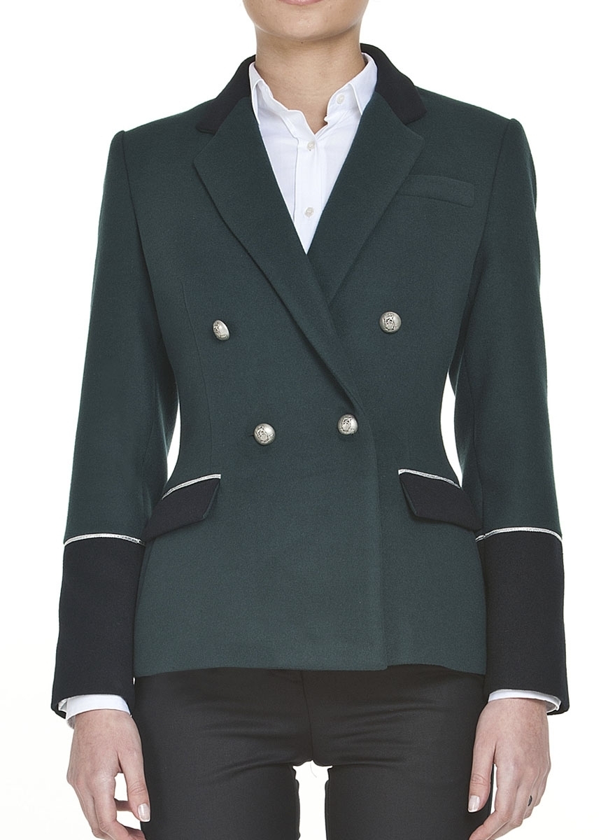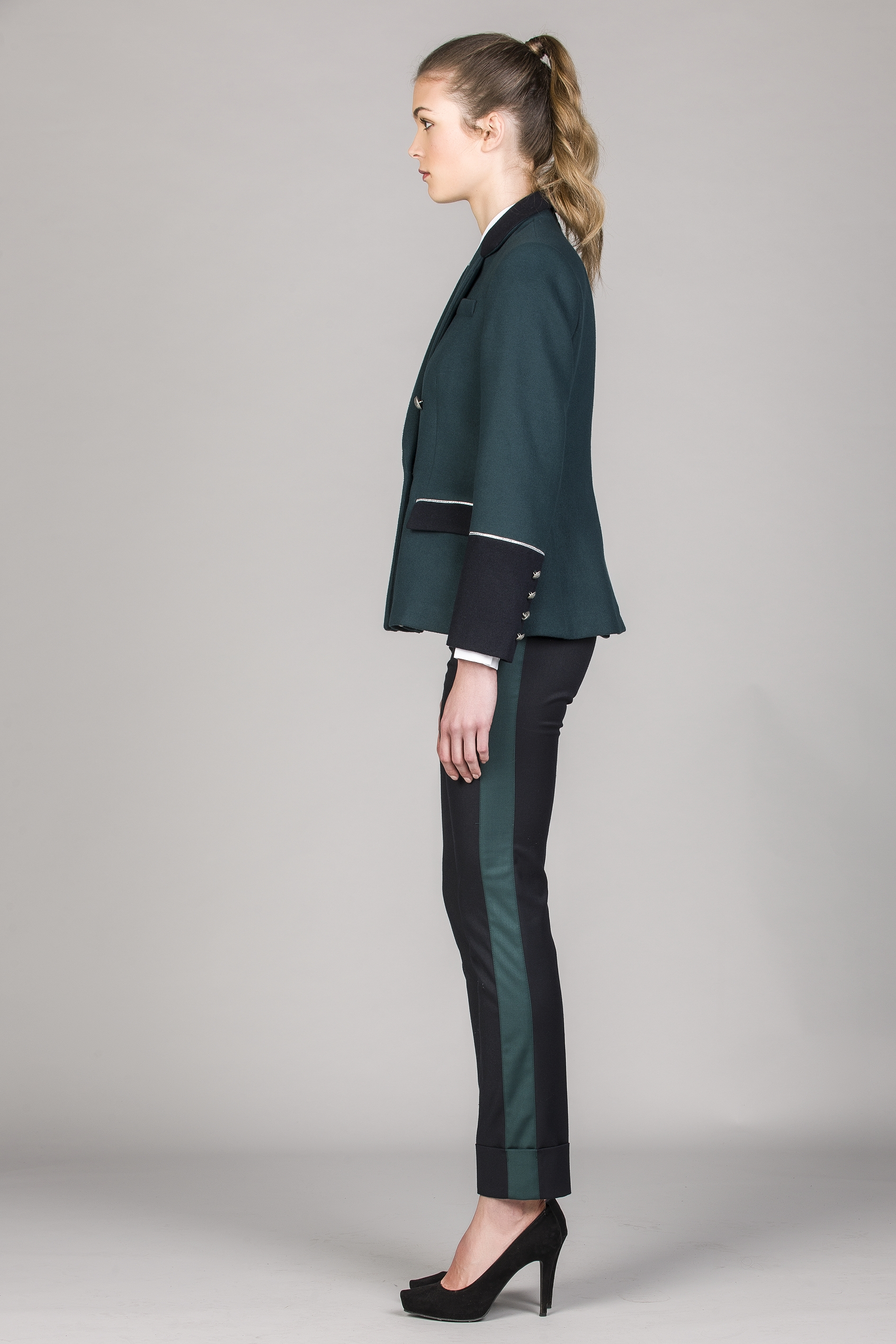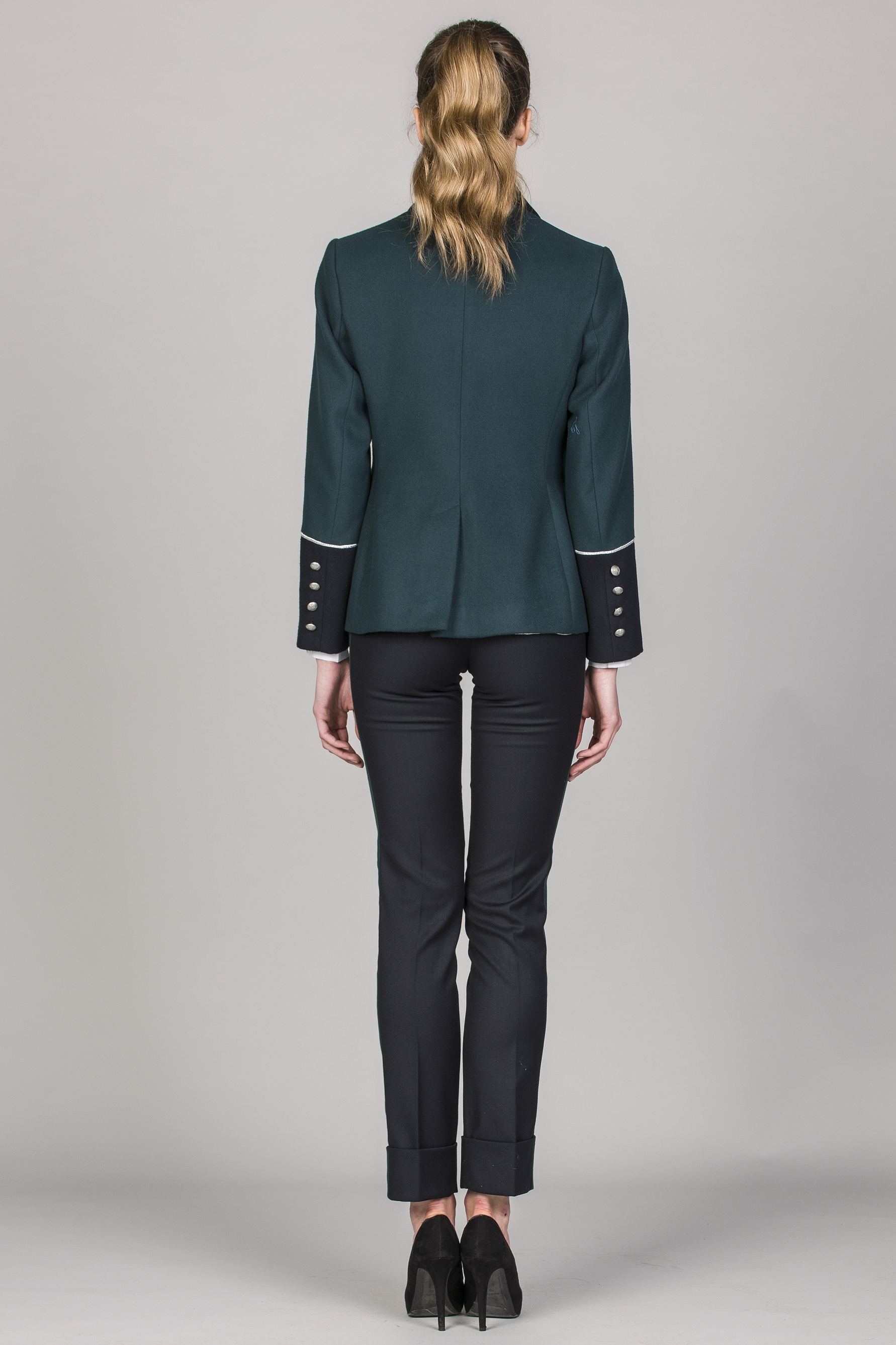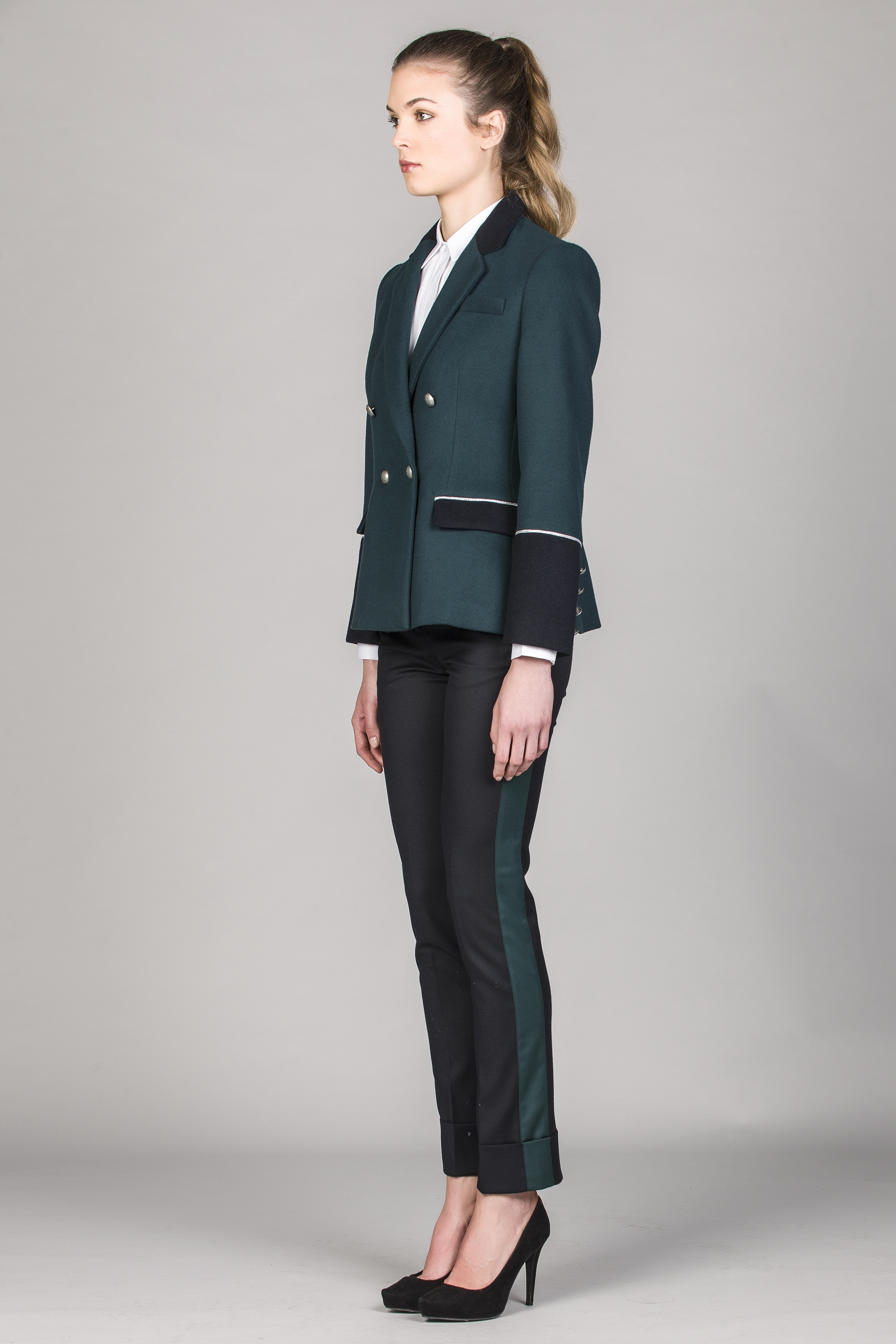Blazer de senhora de trespasse com fila dupla e apertar com 4 botões. Punhos, gola e palas dos bolsos em cor contraste. Bolsos metidos com pala. Bolso no peito. Aplicação de fita galão nos bolsos e punhos. Botões nos punhos.