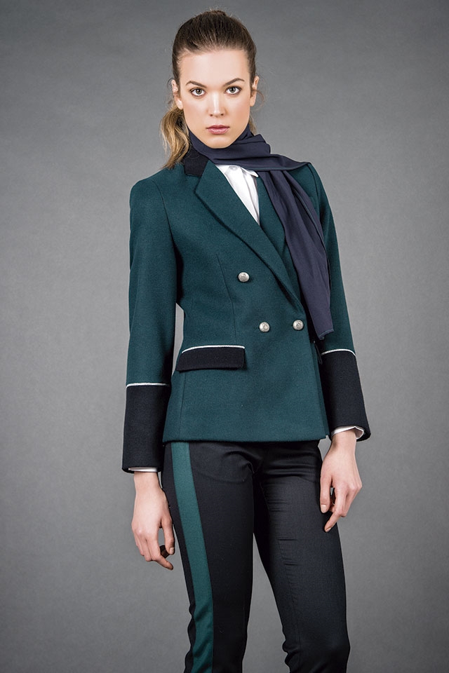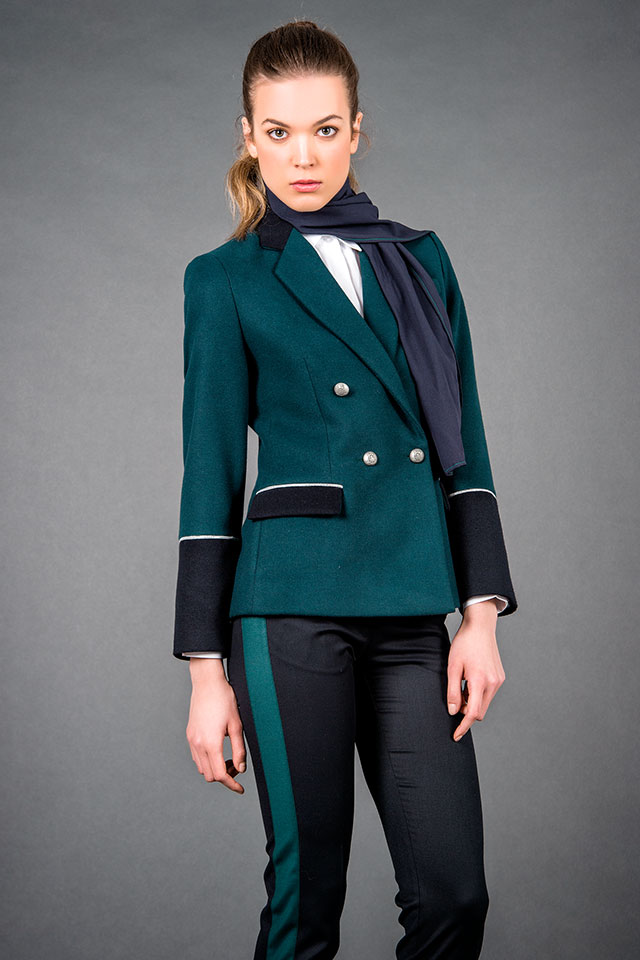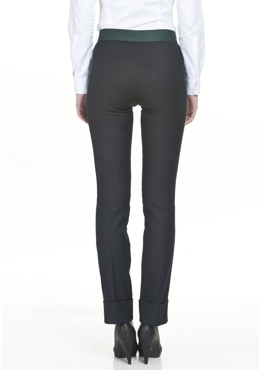 Calças de senhora slim fit, com virola. Bolsos de faca. Modelo vincado. Cós e banda nas laterais em cor contraste.