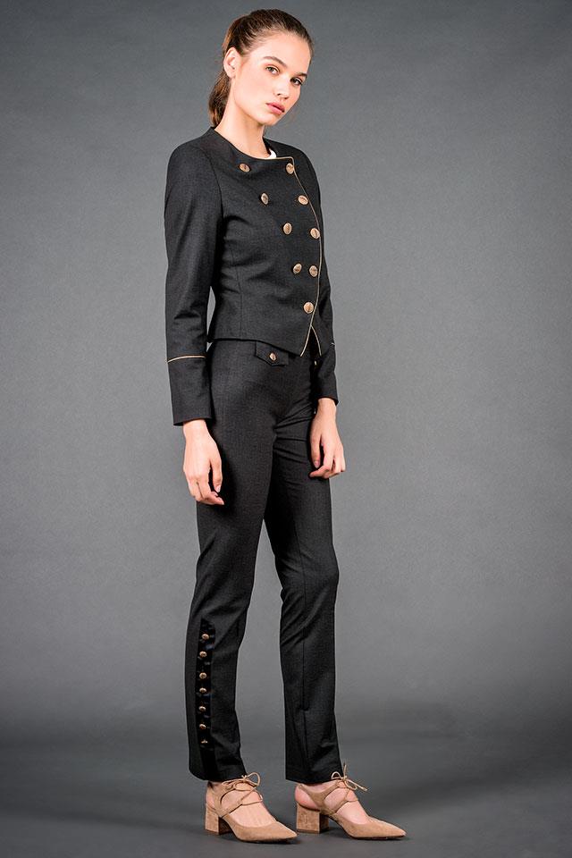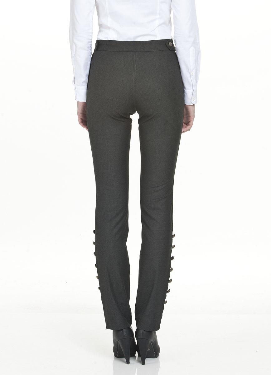 Calça de senhora slim fit, a apertar no lateral com fecho e botão. Dois mini-bolsos com pala na frente. Tiras aplicadas nas pernas com fileira de botões.