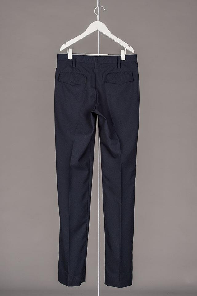 Calças com vinco no meio frente. Presilhas no cinto. Bolsos metidos na lateral. Atrás, dois bolso com pala.