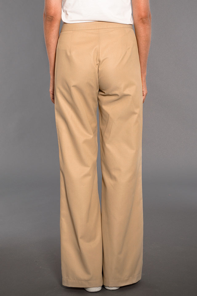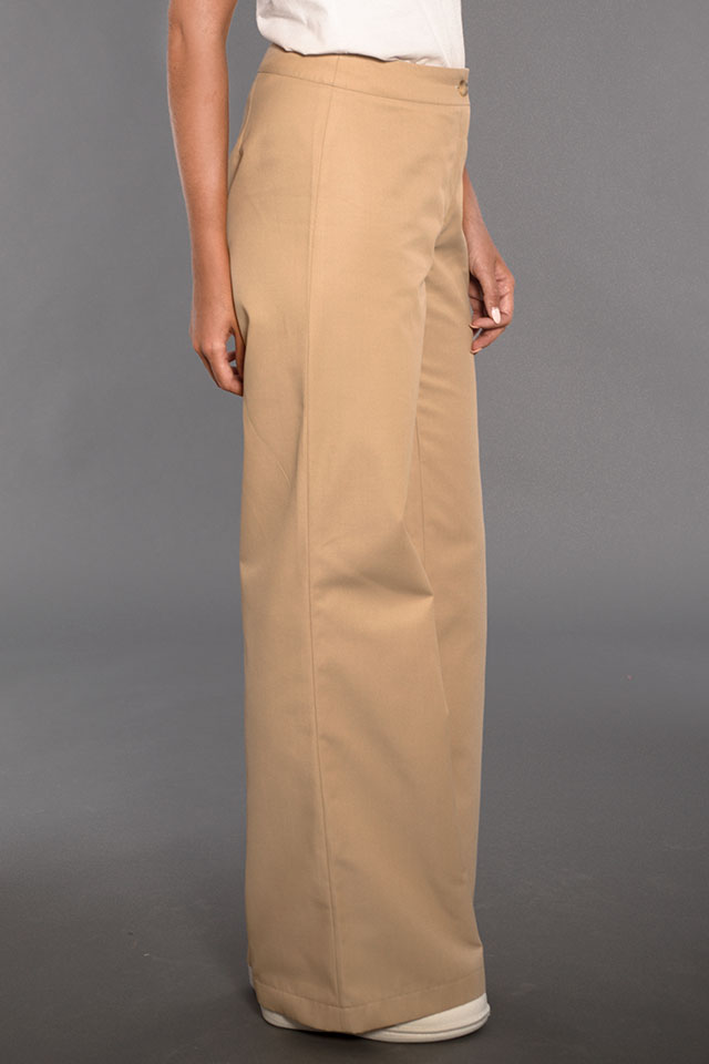 Calça de sarja de formato loose para senhora, com dois bolsos faca na frente e perna boca de sino.