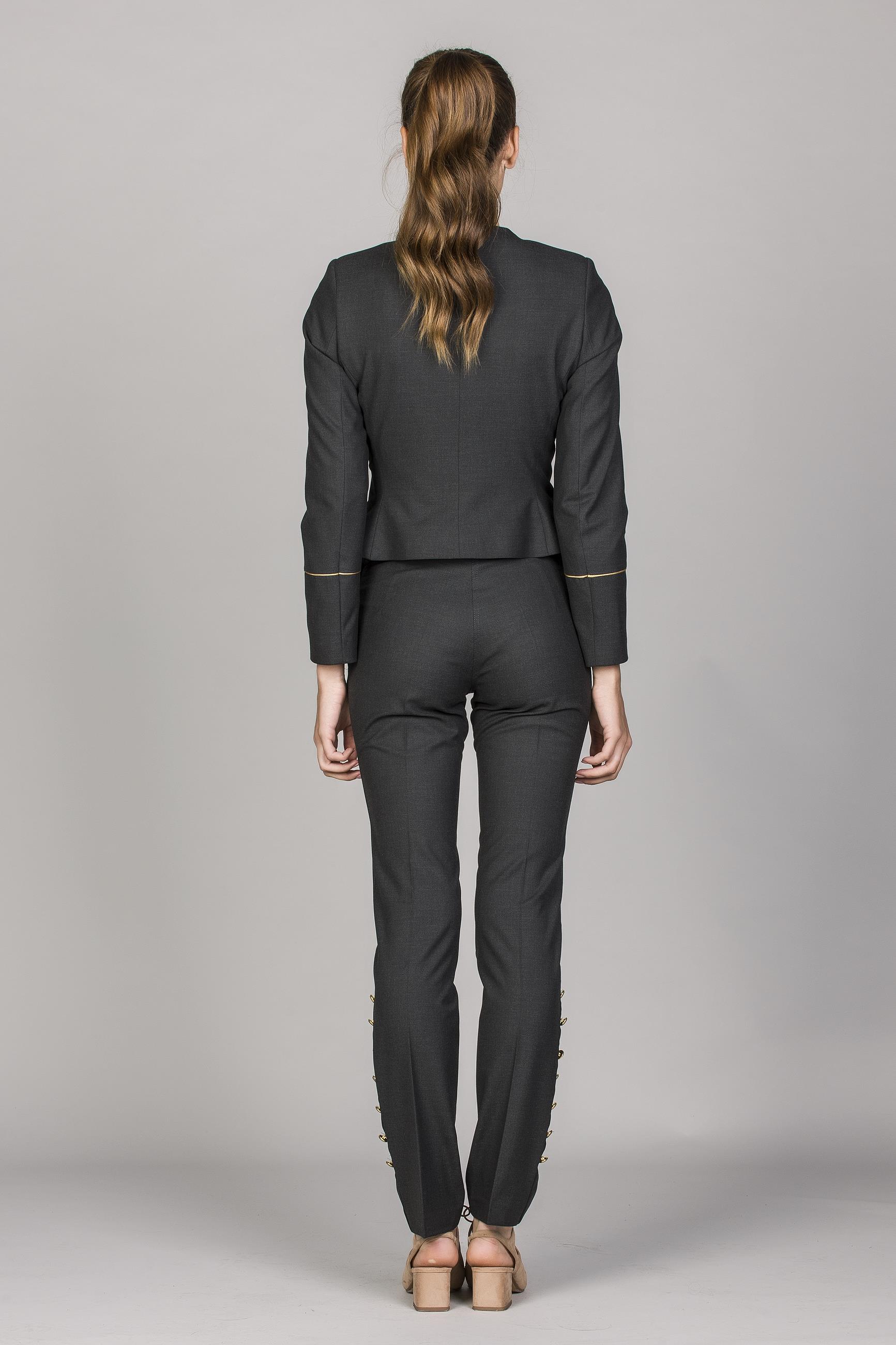 Calças de senhora slim fit com fileira de botões na lateral. Aperta na lateral com fecho. Na frente, duas presilhas no cinto, com botão.
