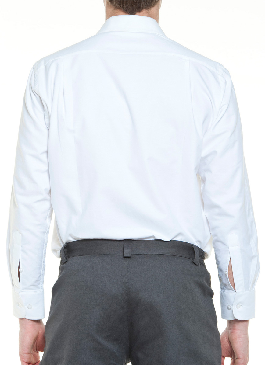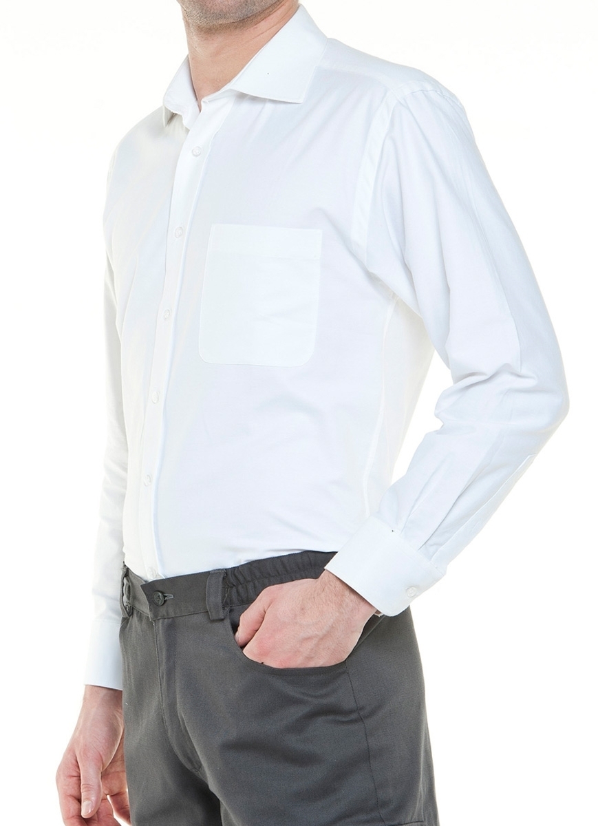 Camisa clássica para homem. Manga comprida com pregas e carcela. Punho com 2 botões para regular largura do punho. Bolso no peito. Escapulário com pregas nas extremidades.