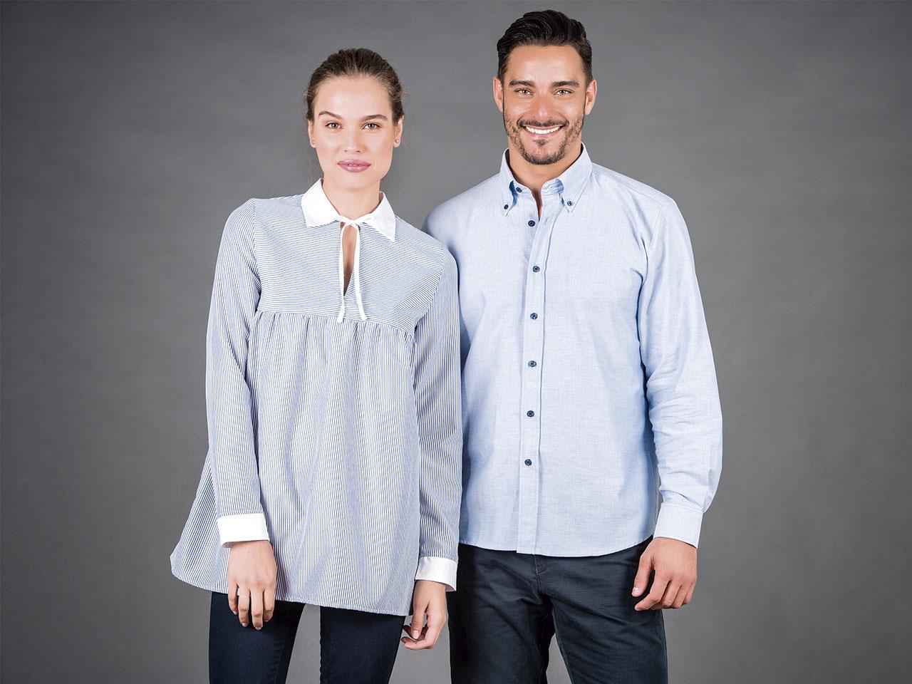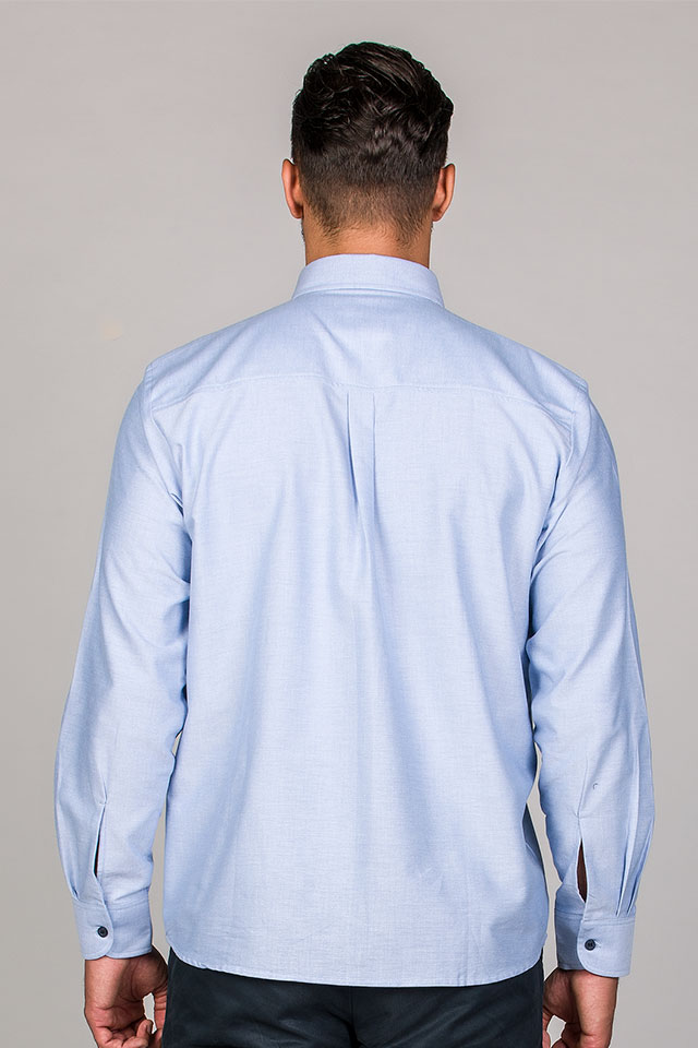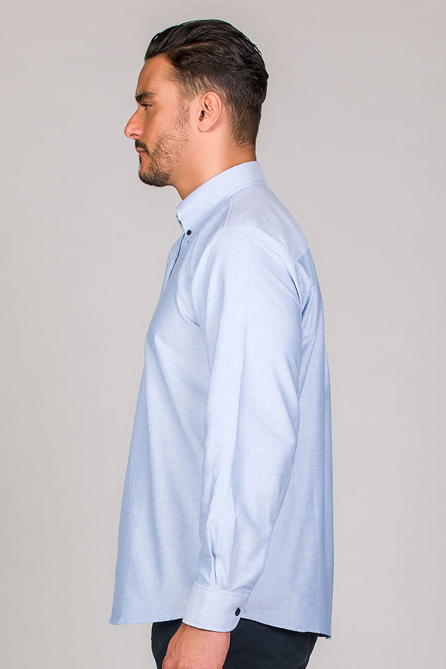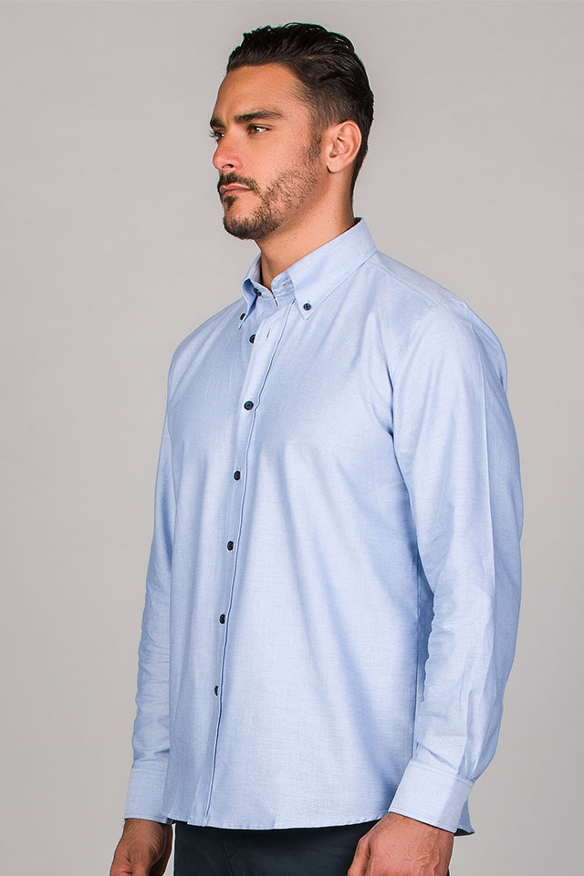 Camisa clássica para homem de manga comprida com botões no colarinho. Escapulário costas com macho invertido ao centro. Botões em cor contraste.