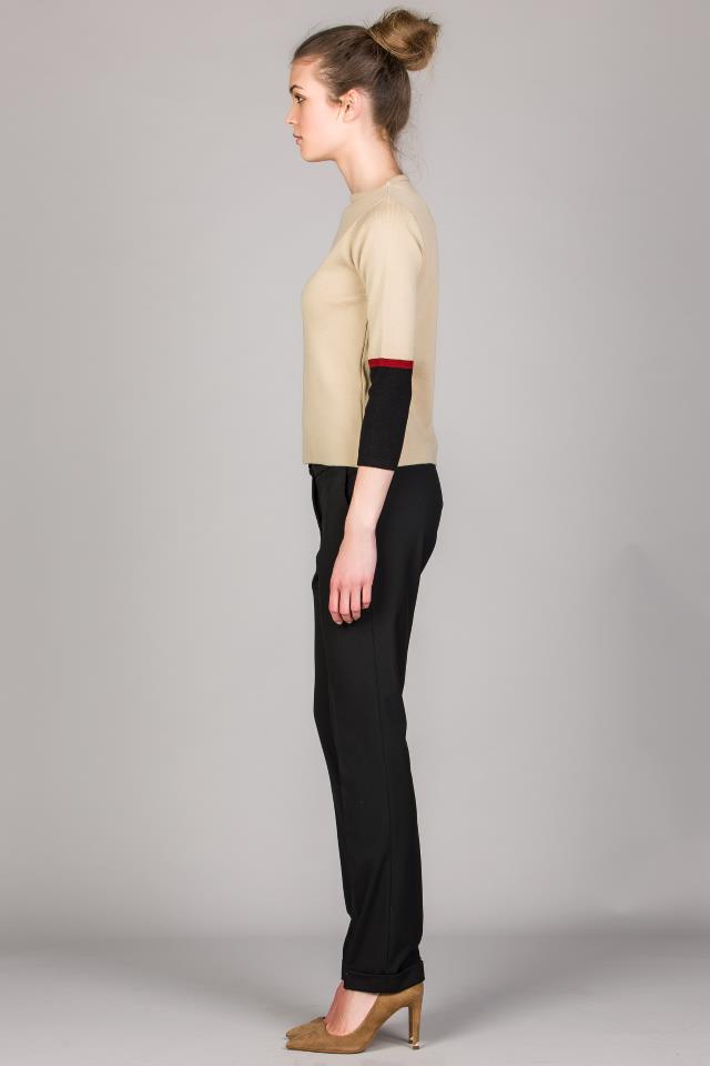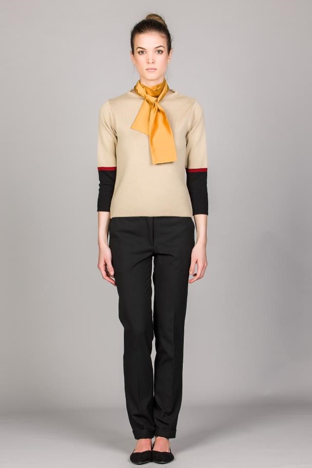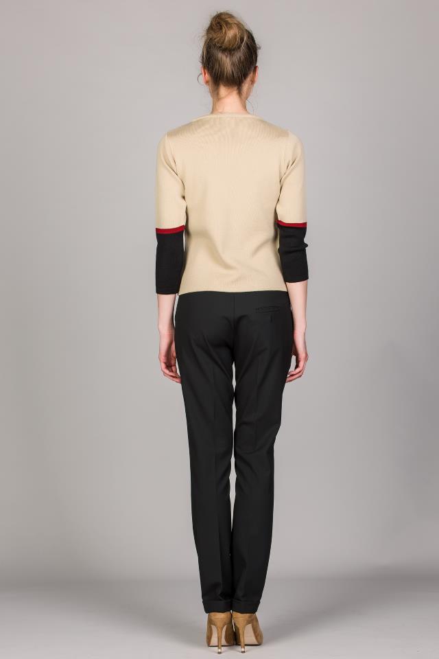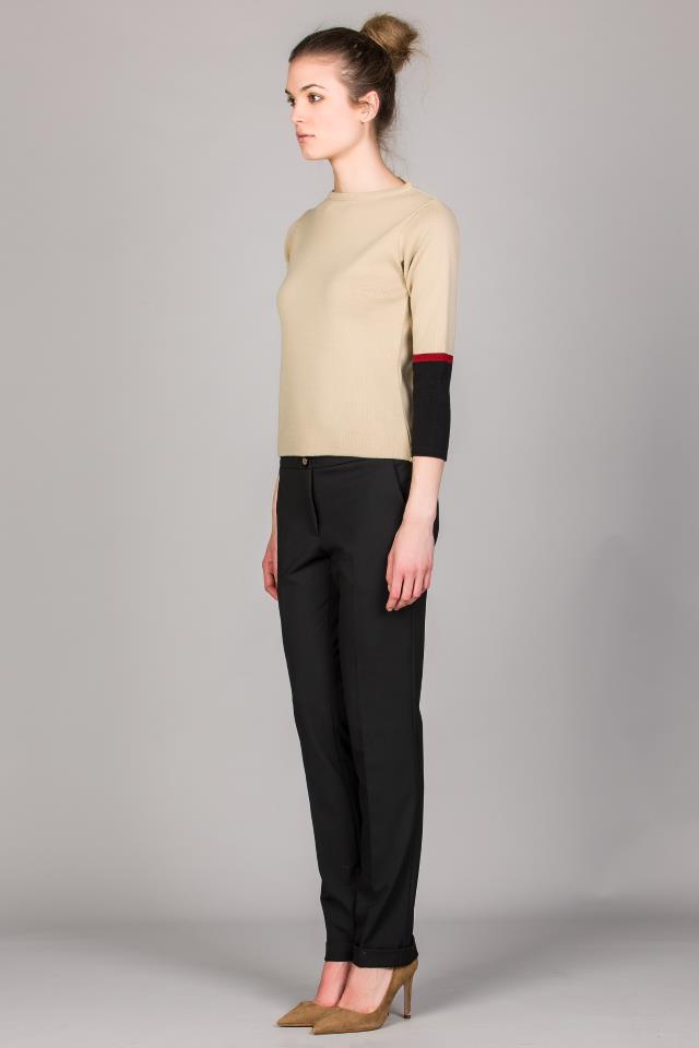 Camisola em malha tricotada para senhora com decote redondo. Manga 3/4 com punhos em cores personalizáveis.
