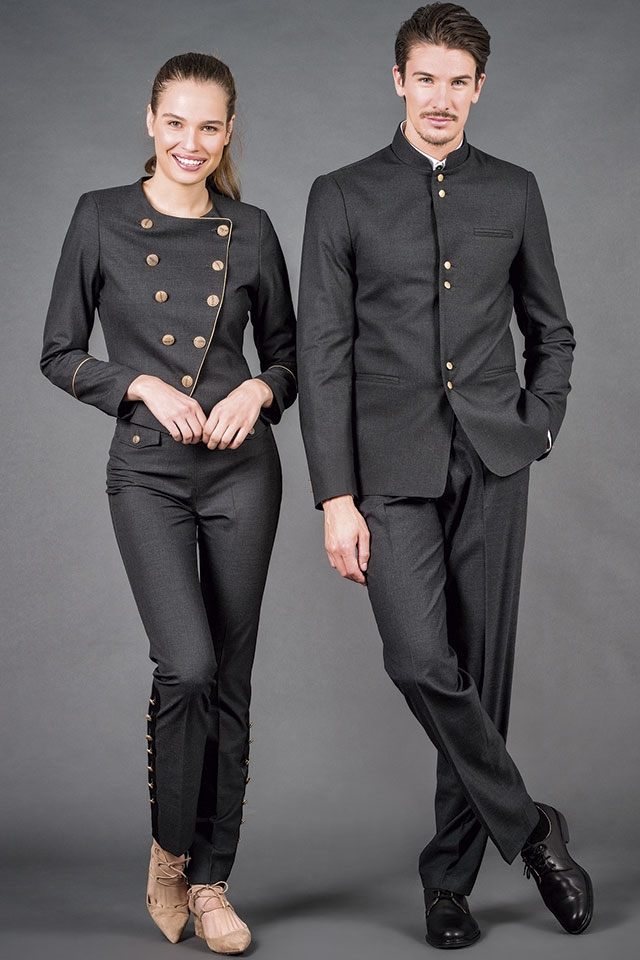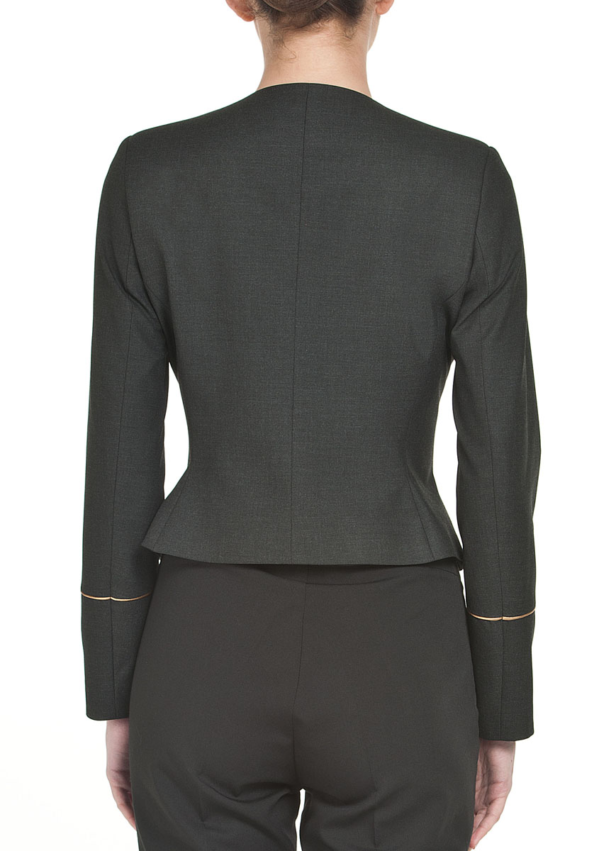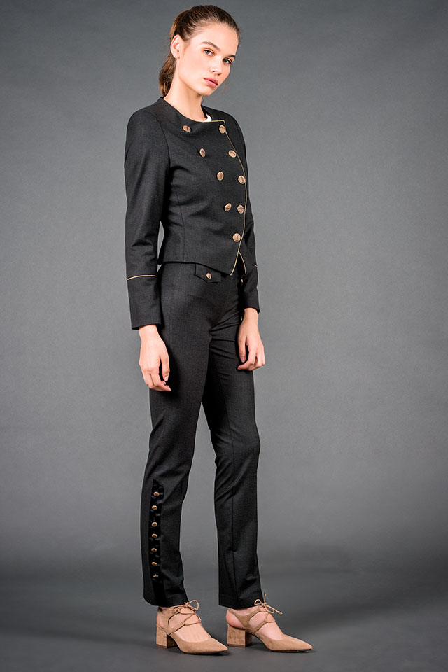 Casaco de senhora cintado de trespasse com nove botões. Decote redondo e vivos nas frentes e nos punhos.