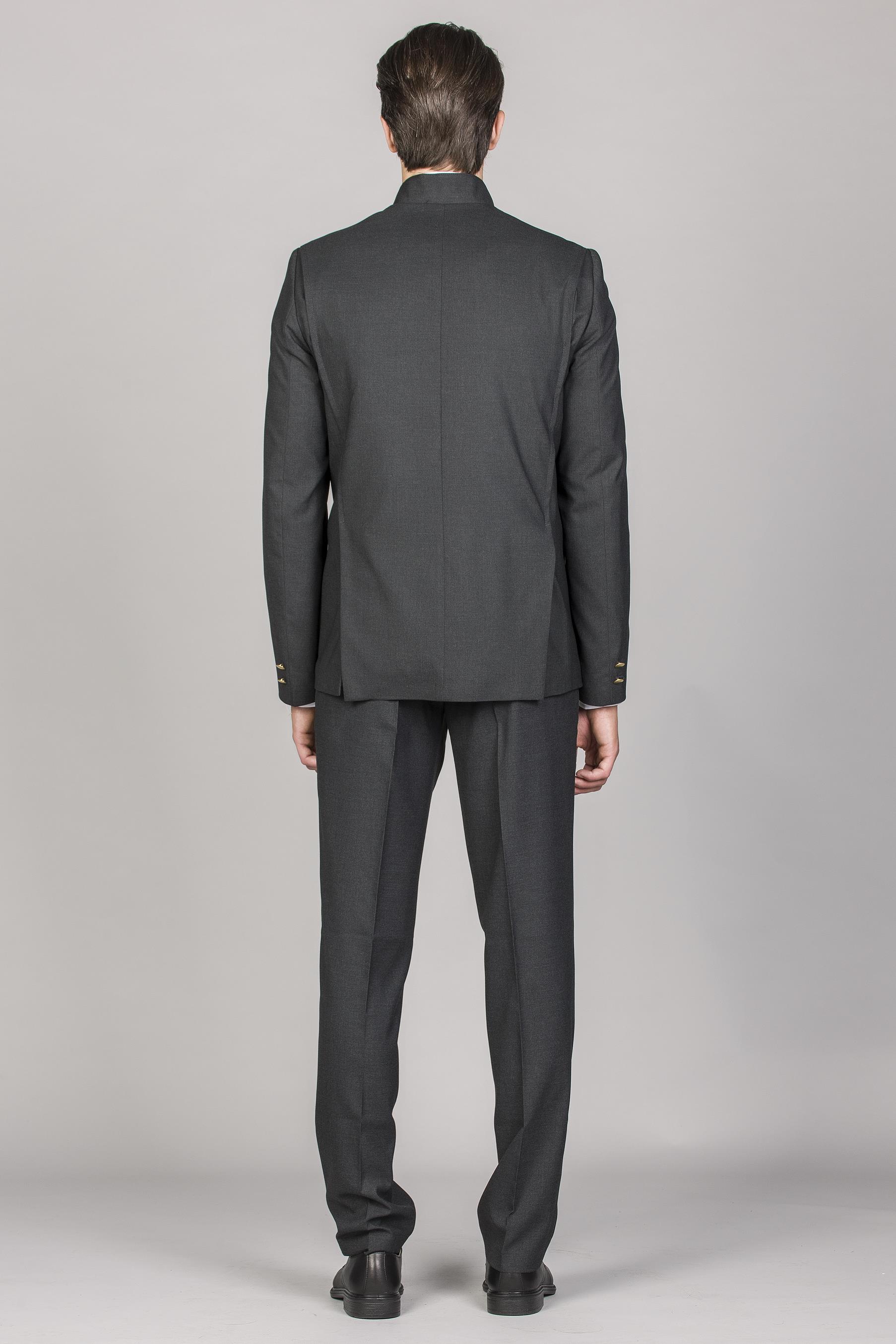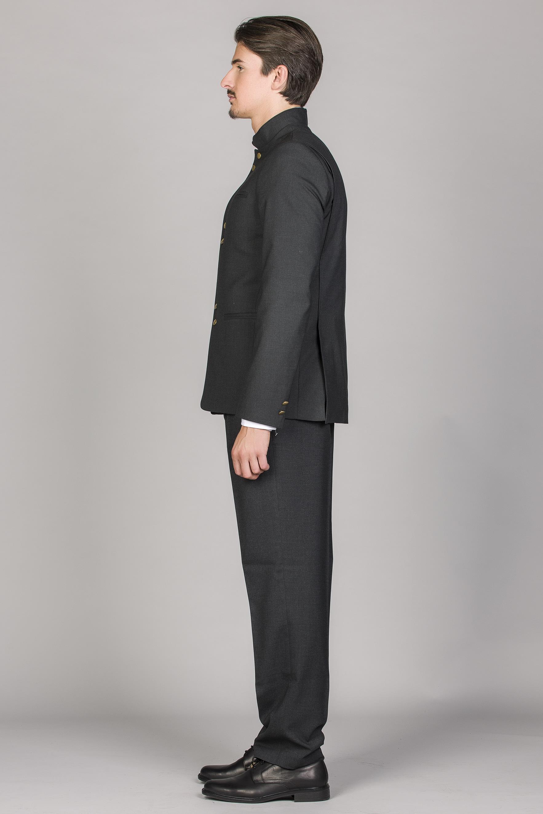 Casaco de homem com gola mao. Aperta na frente com botões aos pares. Três Bolsos metidos com vivo, sendo um no peito. Punho com 2 botões. Aberturas paralelas, atrás.
