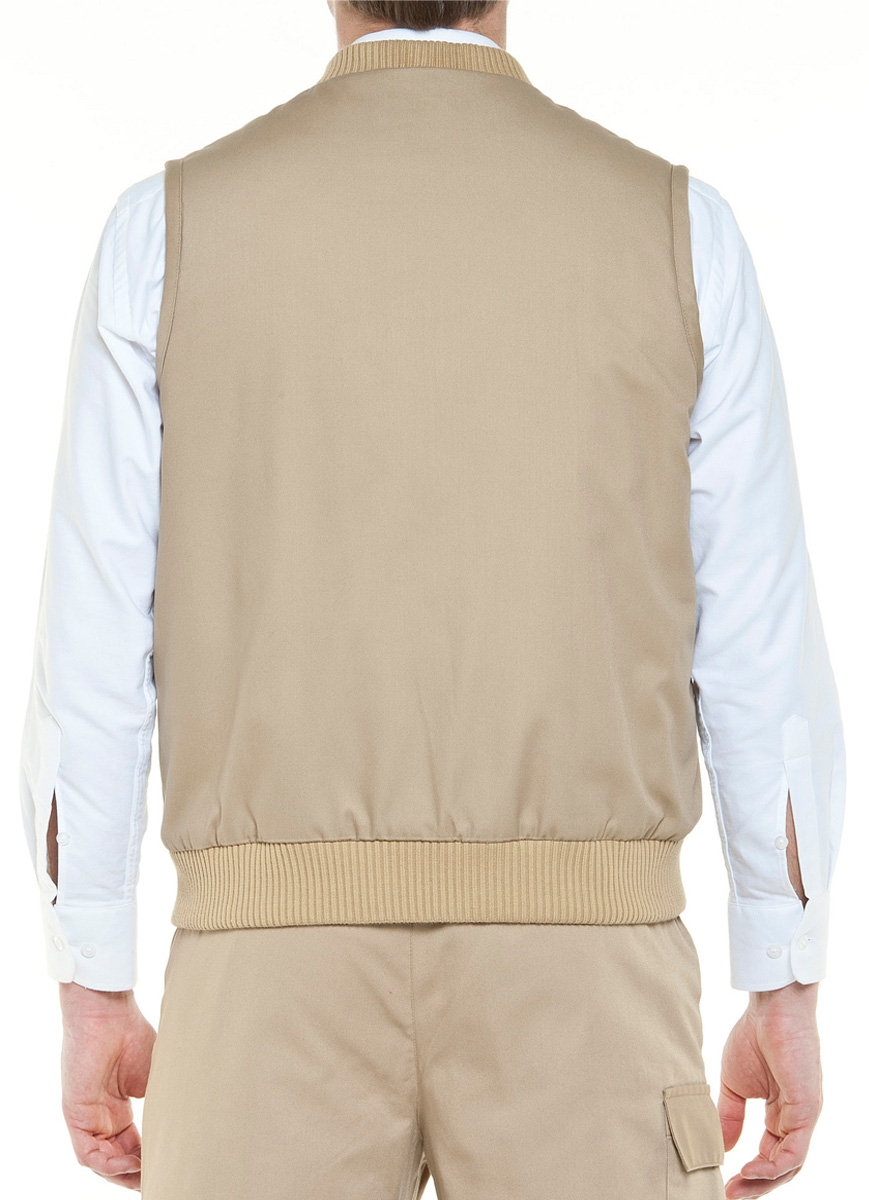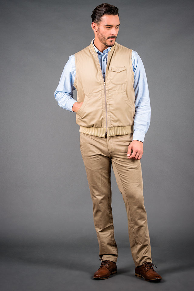 Colete com fecho, com gola e cinto em rib. Bolso canguru. Bolso de chapa com pala no peito do lado direito. Forro em oxford, acolchoado.