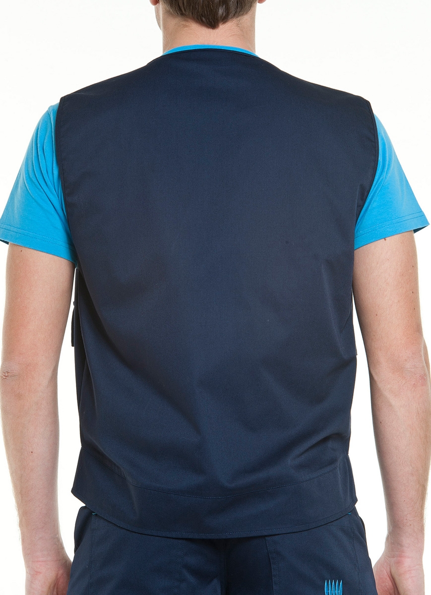 Colete com decote em V e apertar com fecho. Vivos em cor contraste aplicados no escapulário da frente. Dois bolsos de chapa com pala. Um bolso de chapa no peito lado esquerdo.