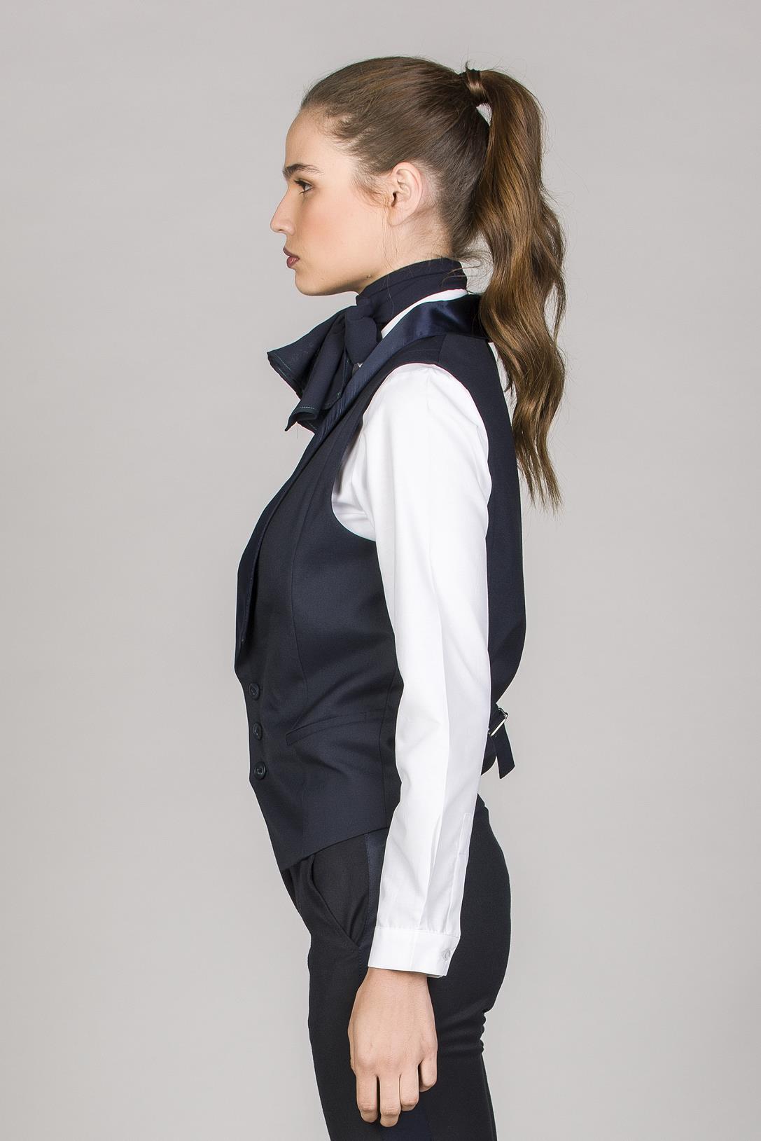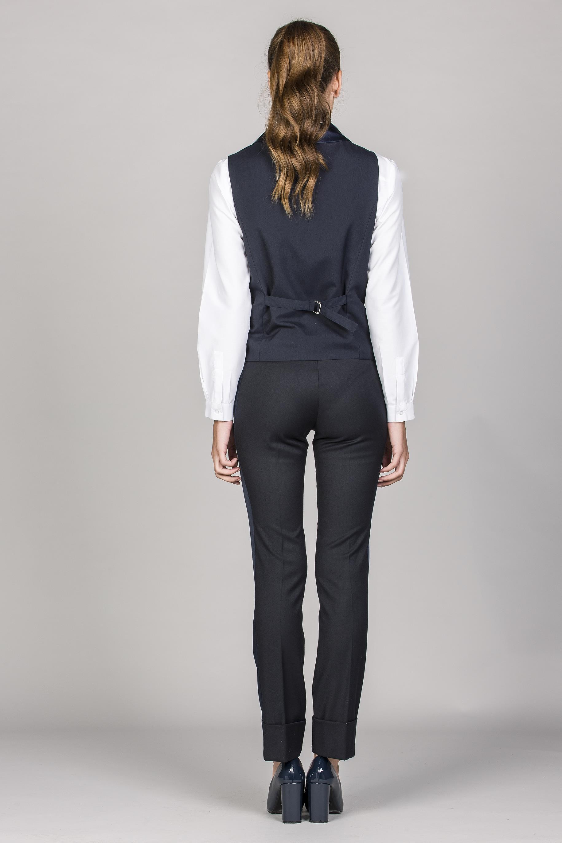 Colete de senhora cintado. Lapela em cetim. Cortes frente e costas para melhor fitting. Aperta na frente com 3 botões. Atrás, cinto regulável por fivela.