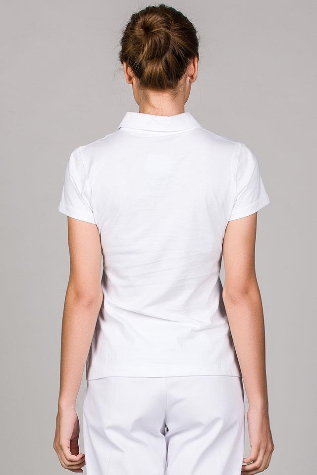 Pólo para mulher com gola camiseiro. Malhete com ilhós e cordão de algodão cruzado. Manga curta. Frente em cor contraste.