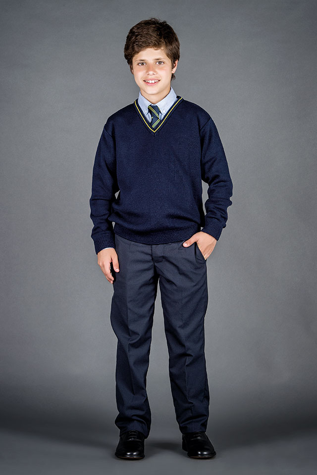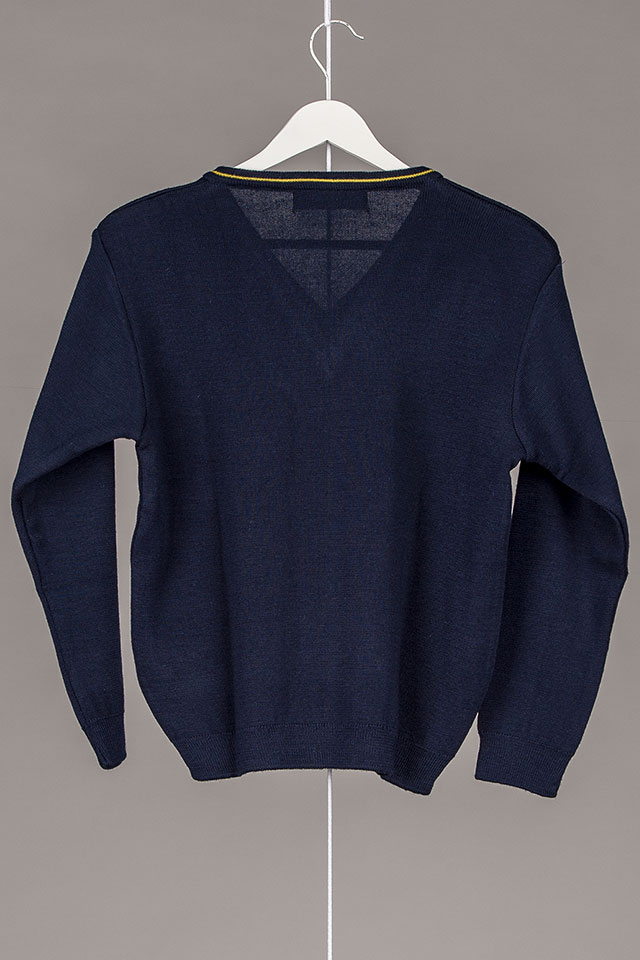 Pullover em malha tricotada, unissexo. Manga comprida. Decote em V. Rib no decote com risca personalizável.