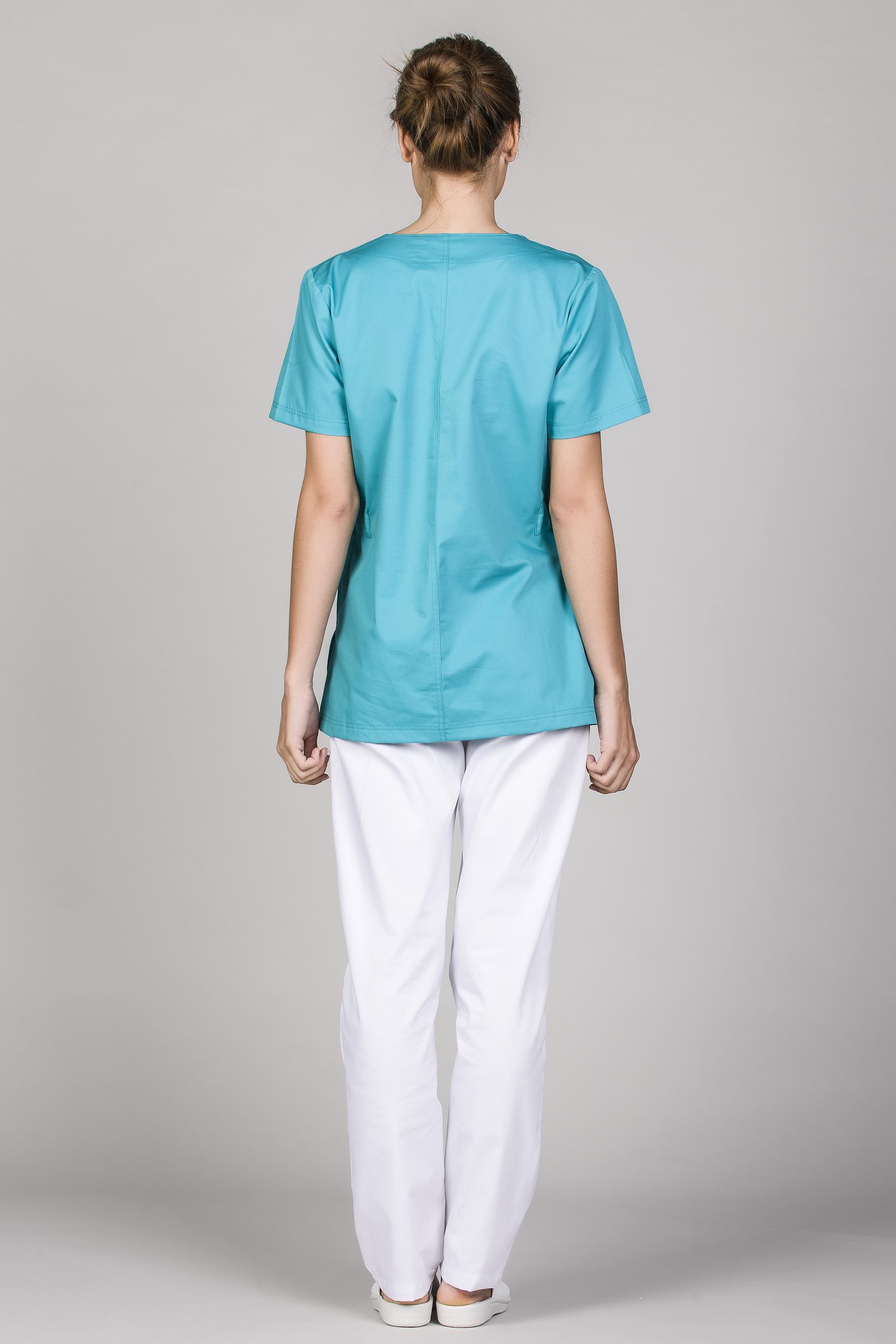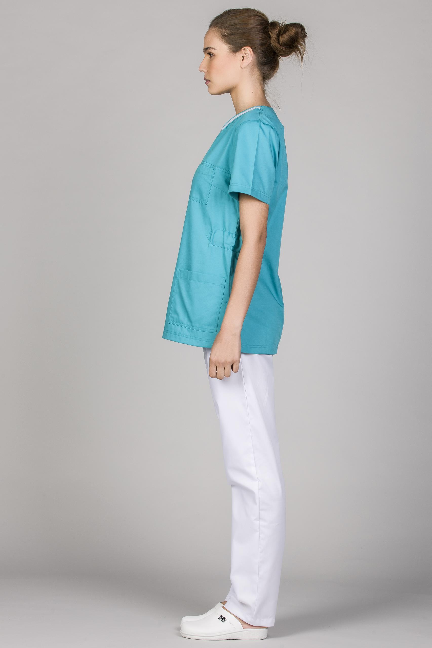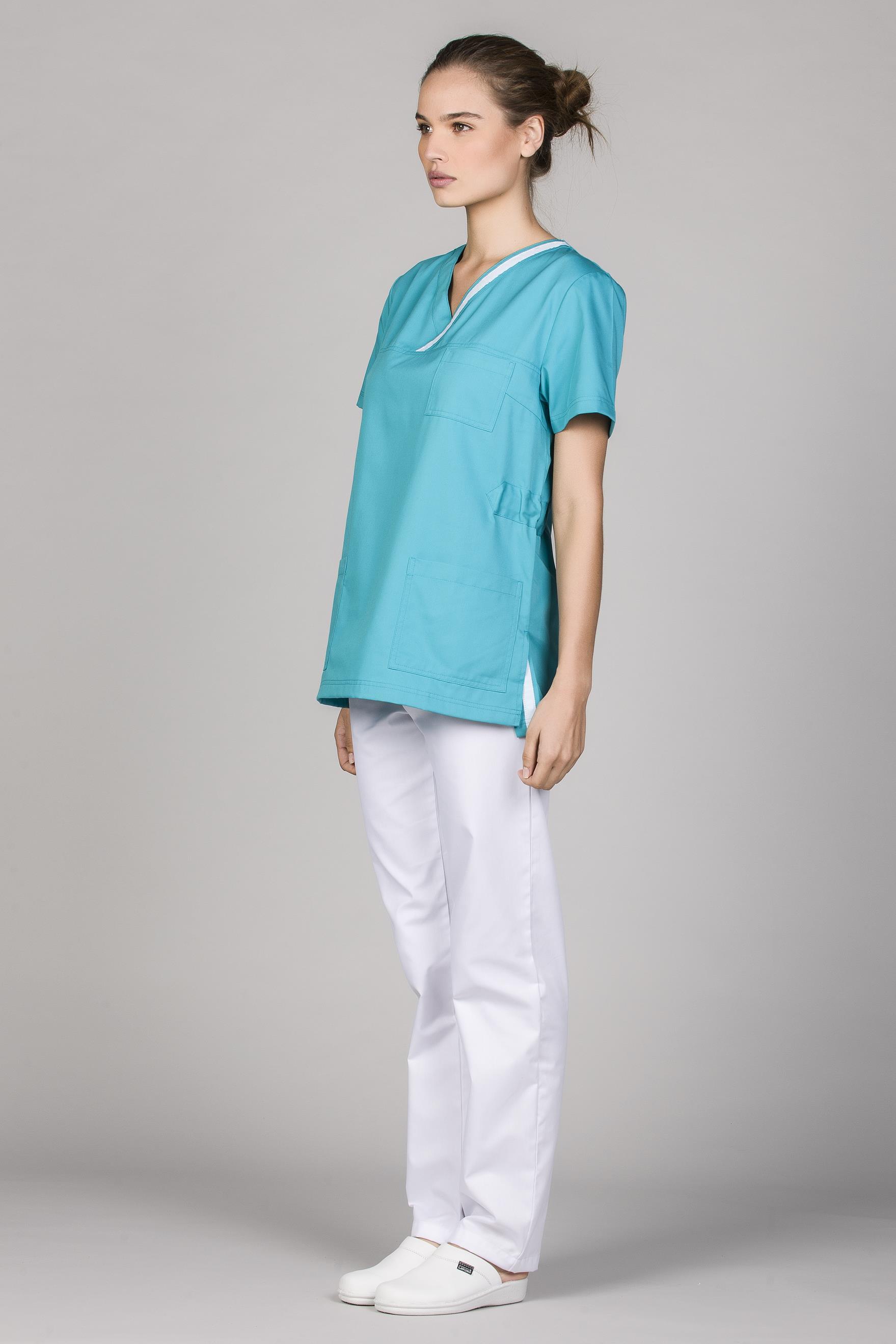 Túnica decote em V, com aplicação de fita personalizada. Manga curta. 3 bolsos de chapa, sendo um no peito.