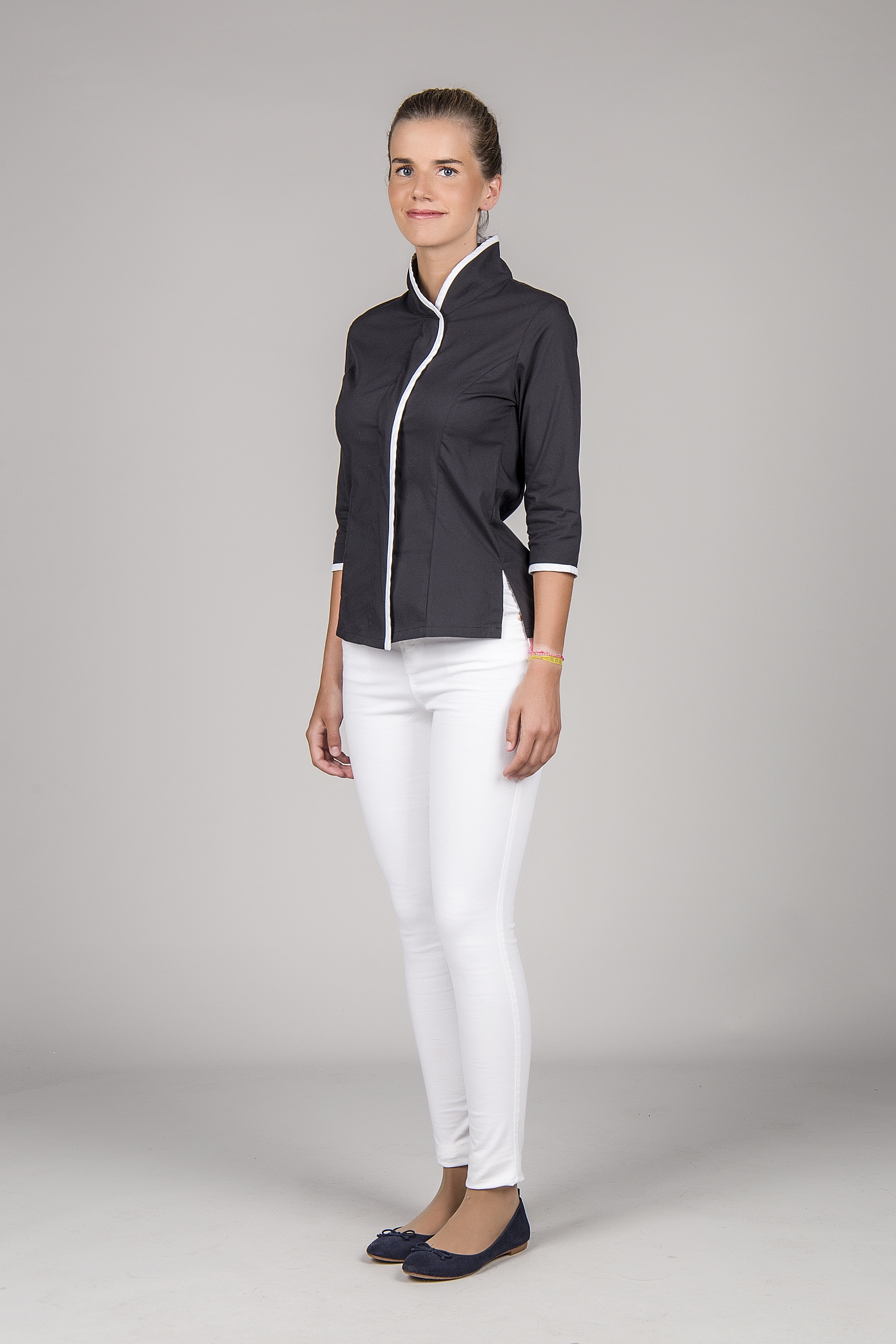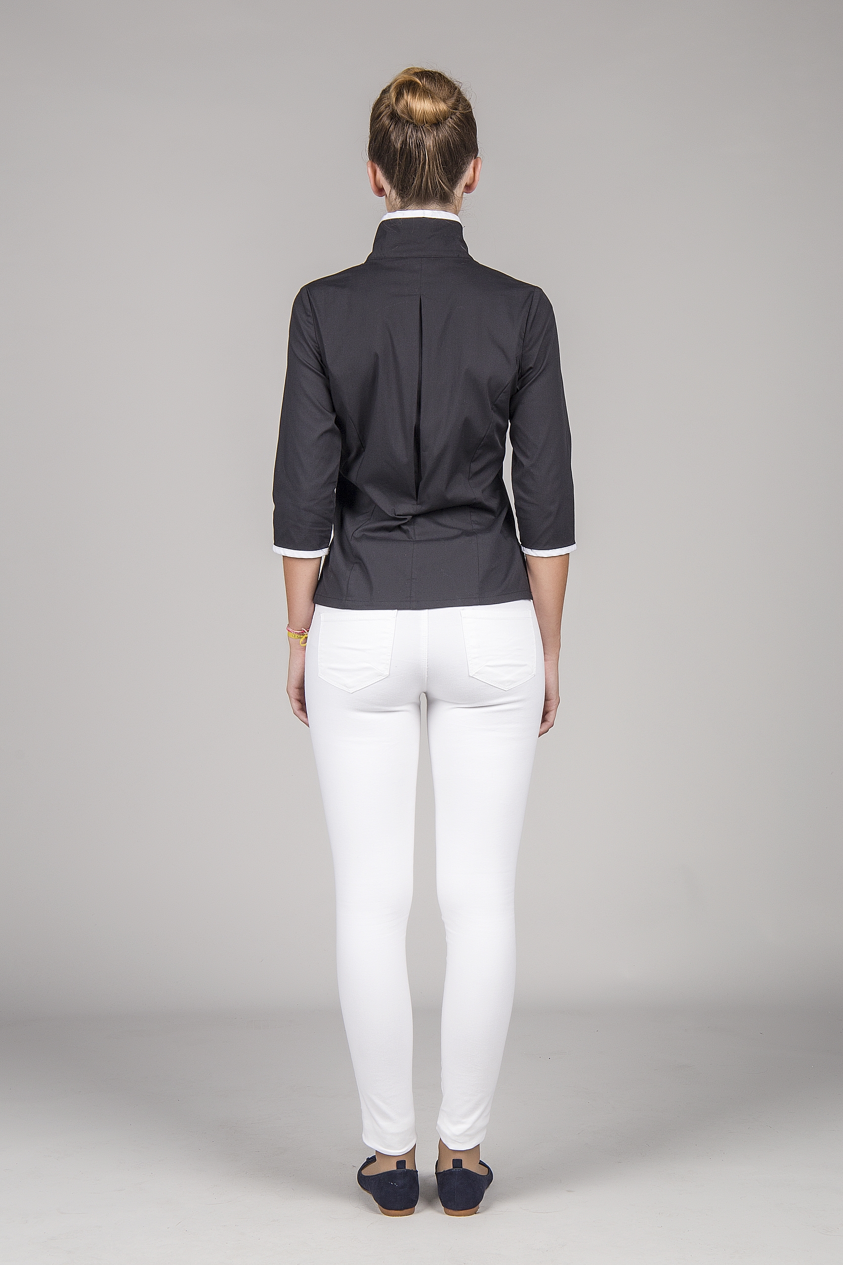 Túnica para mulher com manga 3/4. Gola mao subida. Cortes frente e costas para melhor fitting. Malhete duplo com botões escondidos. Aplicação de tira em cor contraste na gola, decote e punhos.
